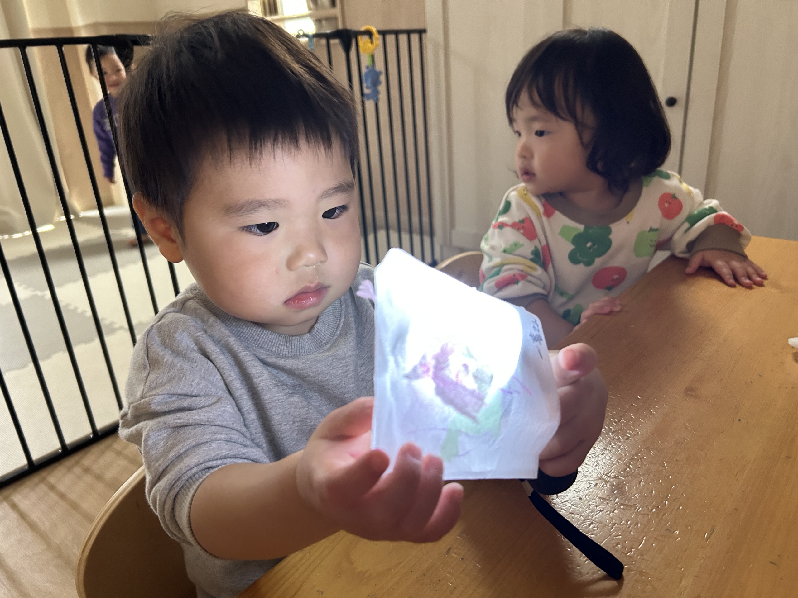 今回のサイエンスは、 お茶パックを使ったランタン作り。 身近な素材を使いながら、 触る・見る・選ぶ・作るを たっぷり楽しむ 乳児保育のカリキュラムだよ。