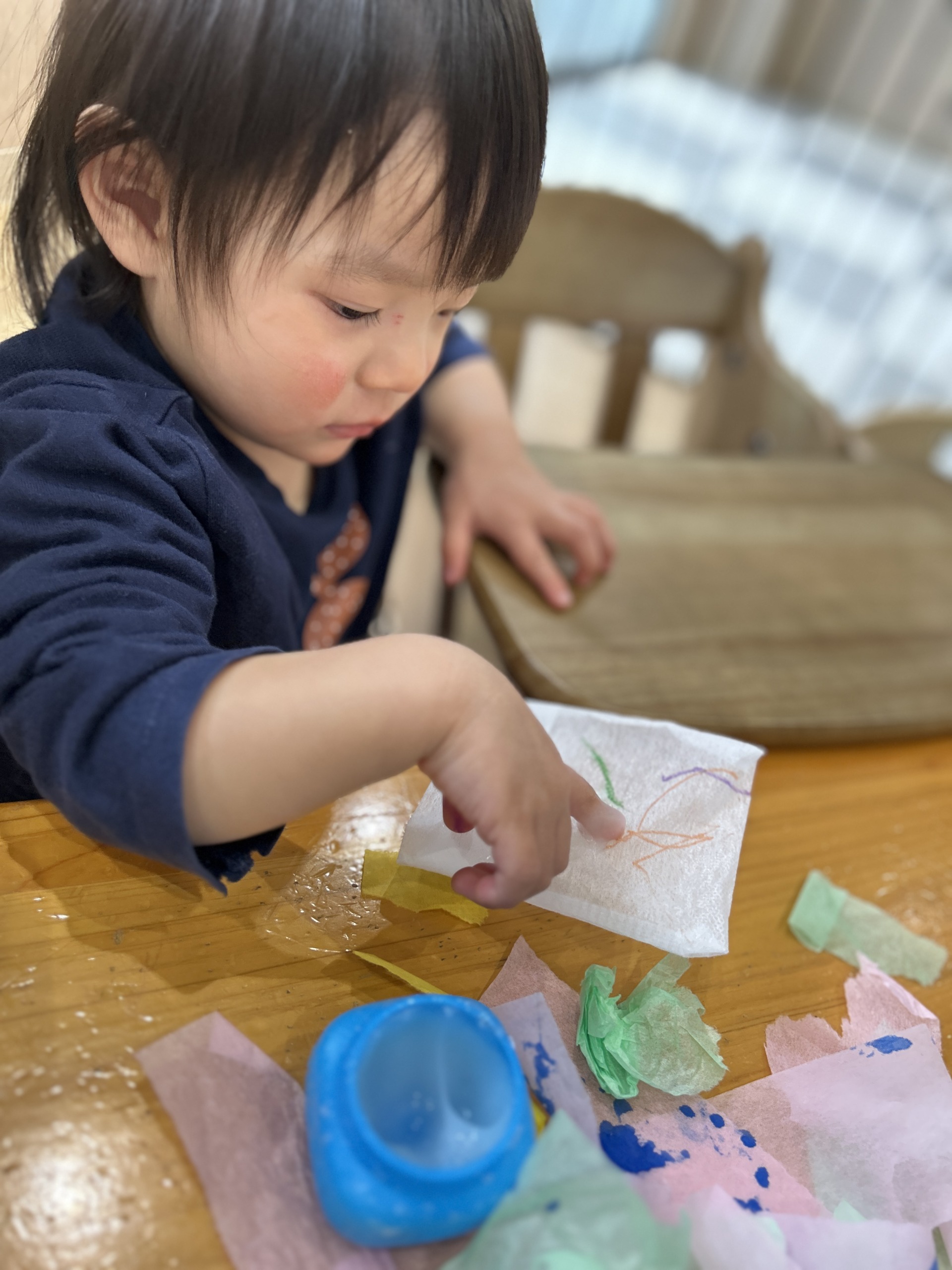 色塗りが終わったら、 次はお花紙をちぎる活動。 カラフルなお花紙が並ぶと、 それだけで 子どもたちの気持ちも ぐっと引き寄せられるね。