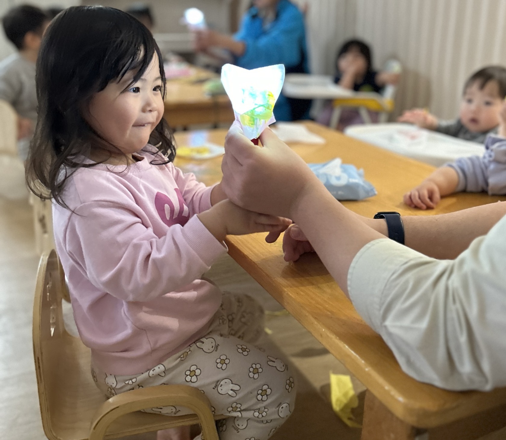 「じぶんでつくったね」 「きれいだね」 先生の言葉に、 誇らしそうな表情を 見せてくれる子どもたち。