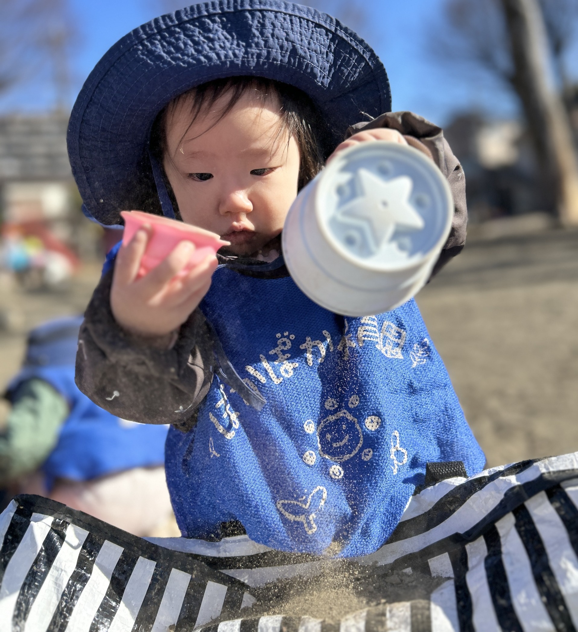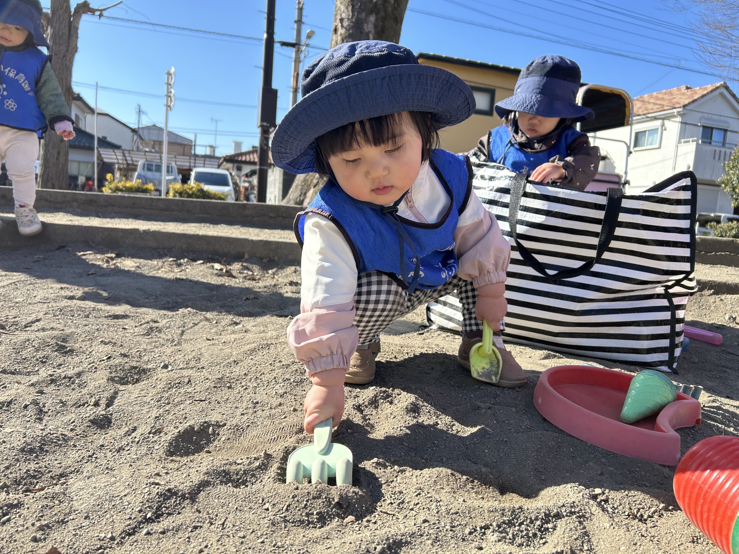 ベビーカーから降りて、芝生や砂の感触を手で確かめます。「さらさらだね」「なにかあるかな?」と先生が声をかけると、砂をぎゅっと握ったり、じっと見つめたり。それぞれのペースで自然に触れる時間となりました。乳児保育では、こうした感覚遊びがとても大切です。