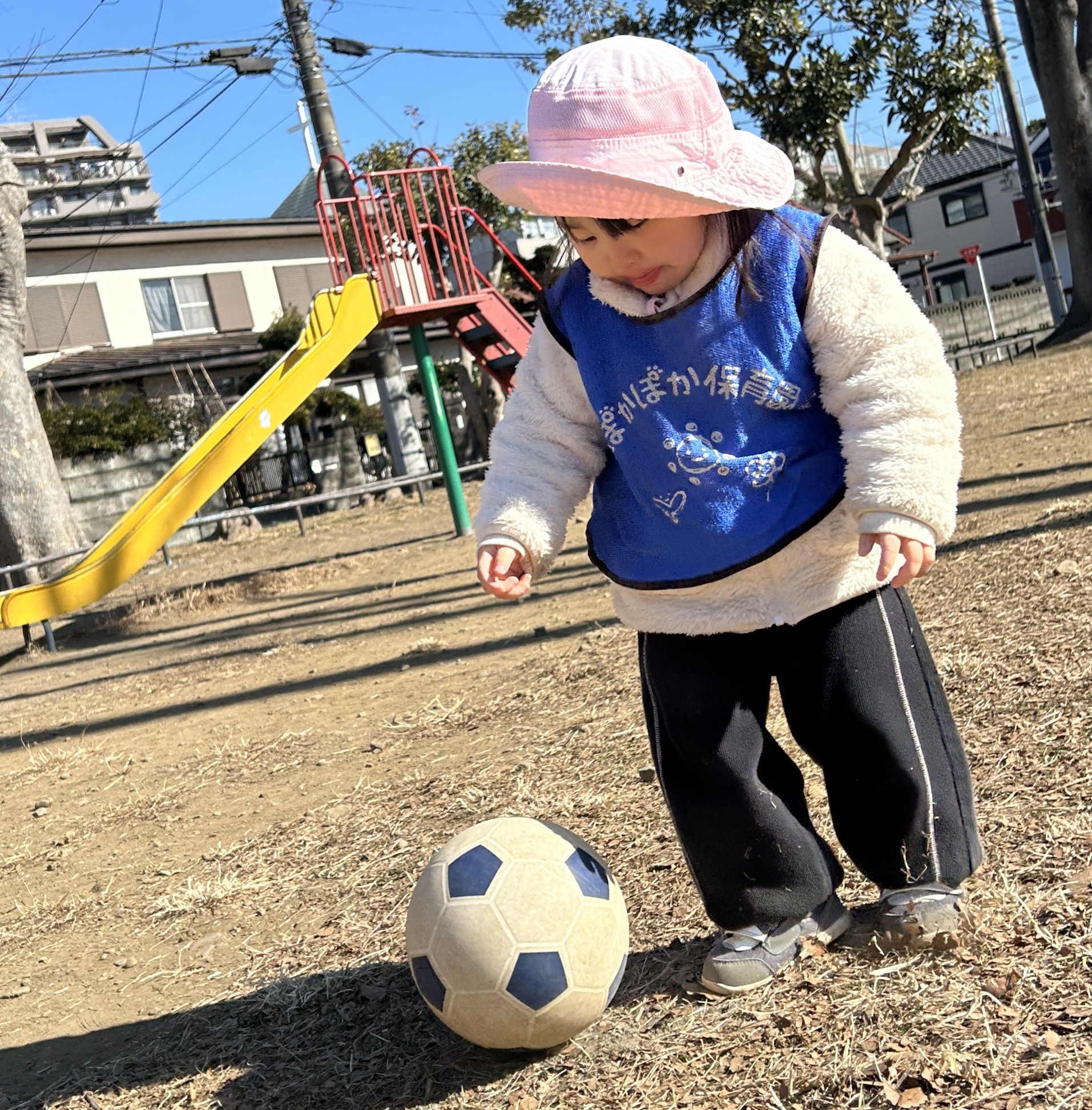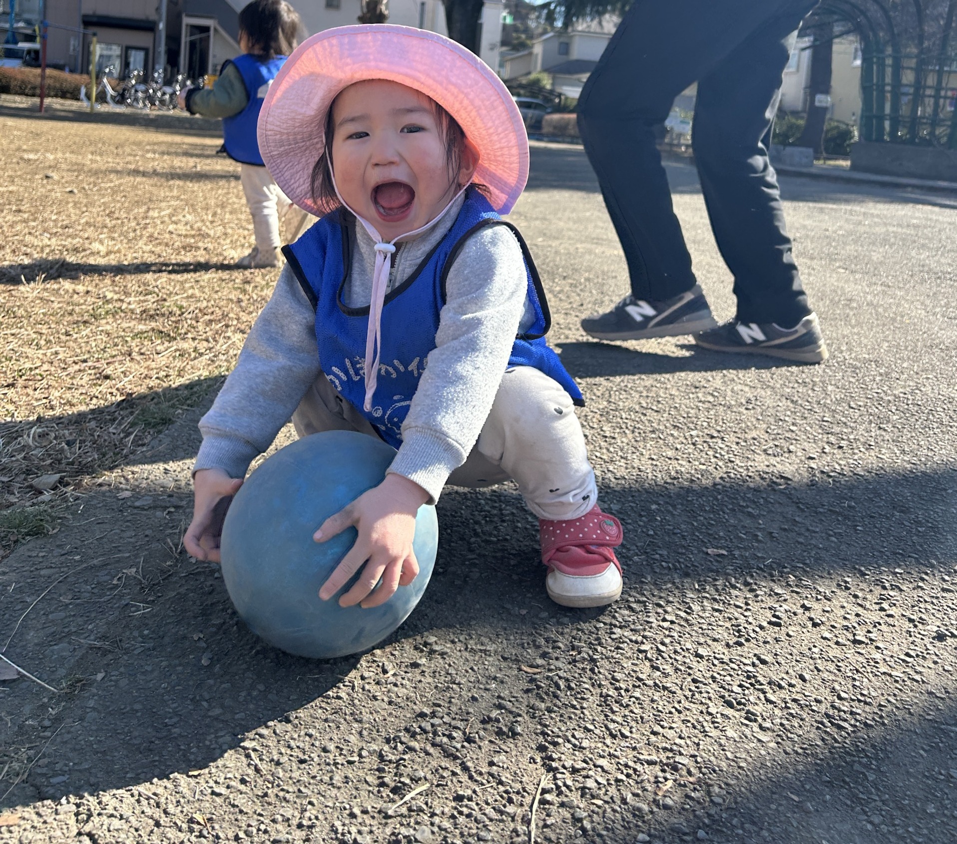 ボール遊びも大人気。「まてまてー」と追いかけたり、転がしたボールを拾ったりと、公園中を元気に走り回る子どもたち。「いっぱい走ったね」「たのしいね」と声をかけると、汗をかきながらも満足そうな表情です。