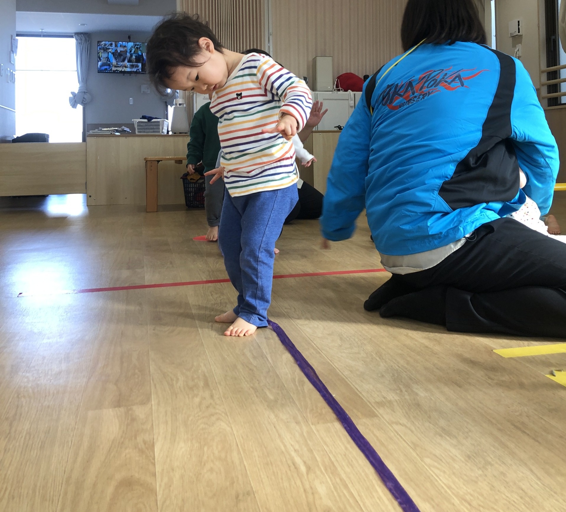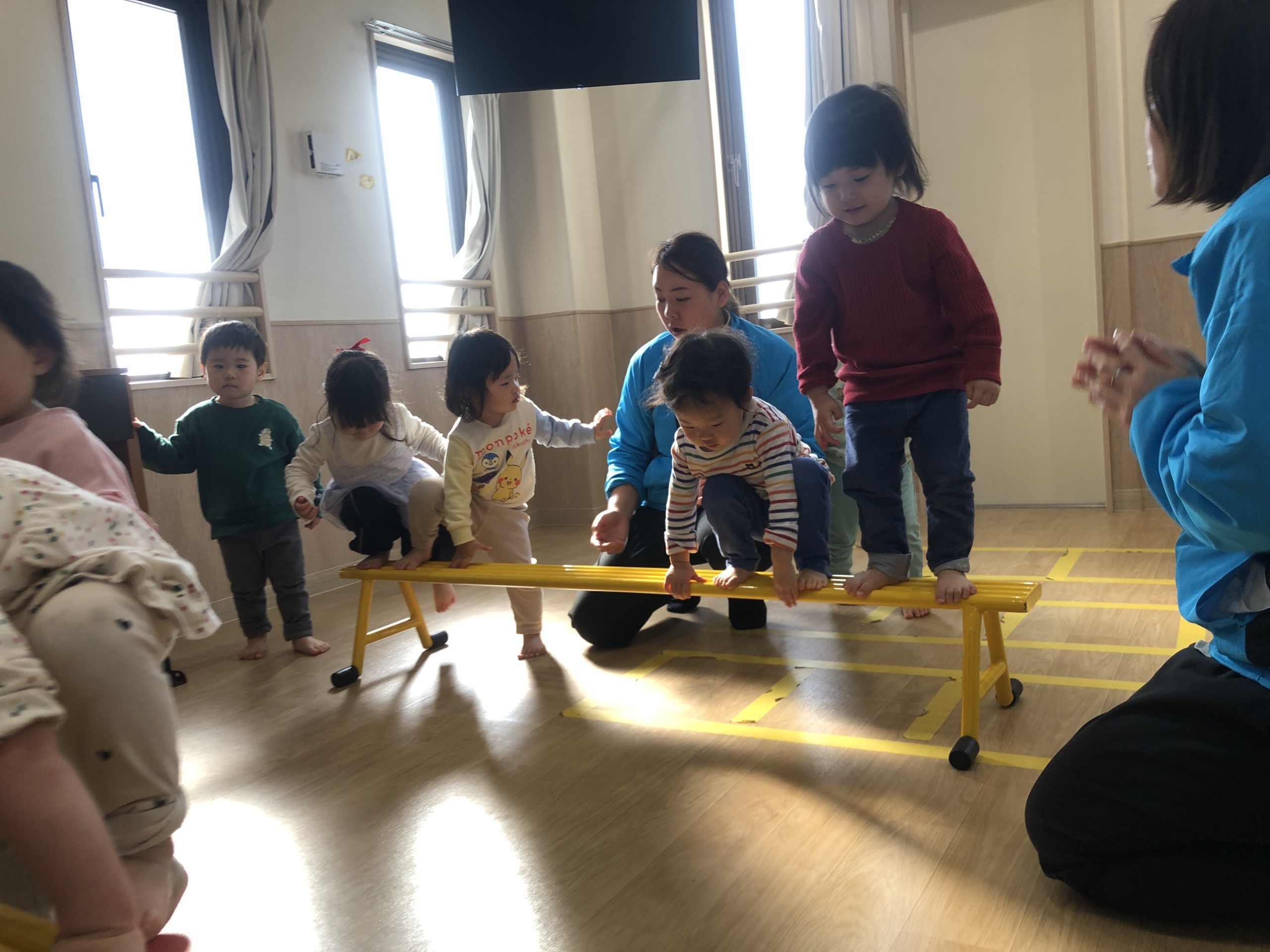 一本橋では、バランスを取りながら慎重に進みます。先生がそばで「ゆっくりでいいよ」「だいじょうぶ」と声をかけると、腕を広げて一歩ずつ前へ。途中で落ちそうになると、「せんせい!」と助けを求める姿もあり、安心できる存在がそばにいることで、挑戦する気持ちが育っていきます。