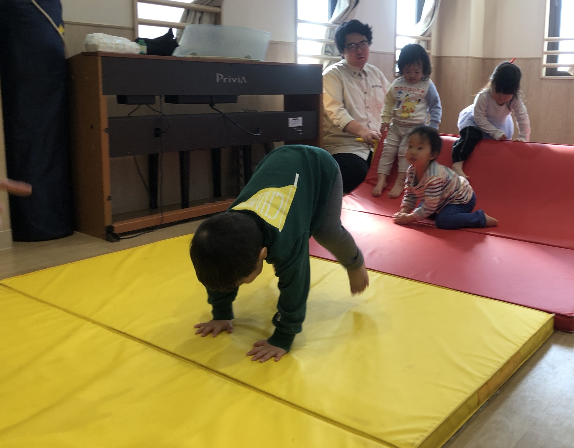 今日は1歳児の虹組さんが、安田式運動遊びに取り組みました。まずはウォーミングアップからスタートです。「くまさんみたいに歩いてみよう」と先生が声をかけると、両手と両足をしっかり床について、よいしょよいしょと進む子どもたち。「くまさん、つよいね」「がんばってるね」と声をかけられ、さらにやる気が高まります。