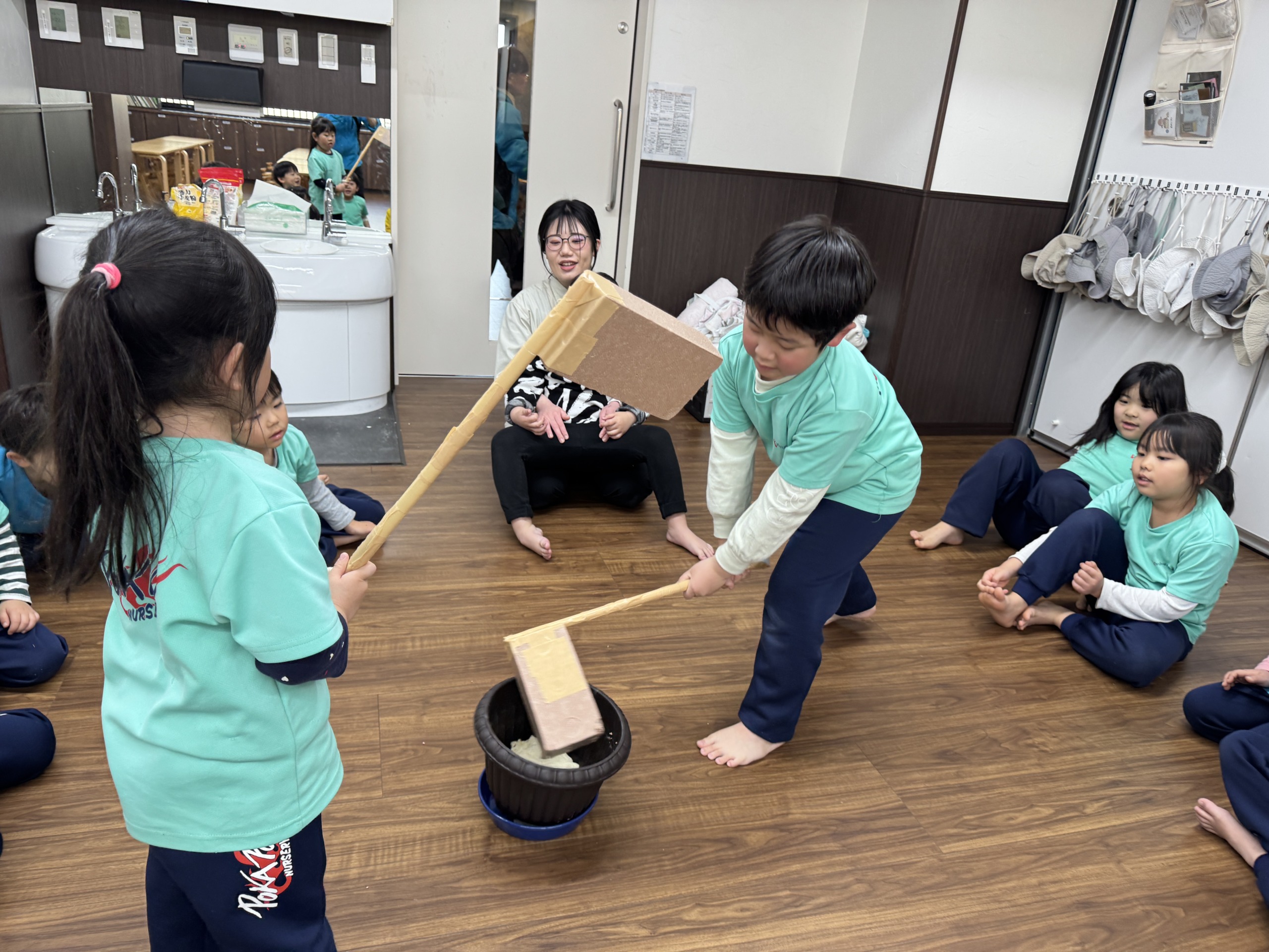 次はいよいよ、今度のイベントで行う**「餅つき」**の練習です。