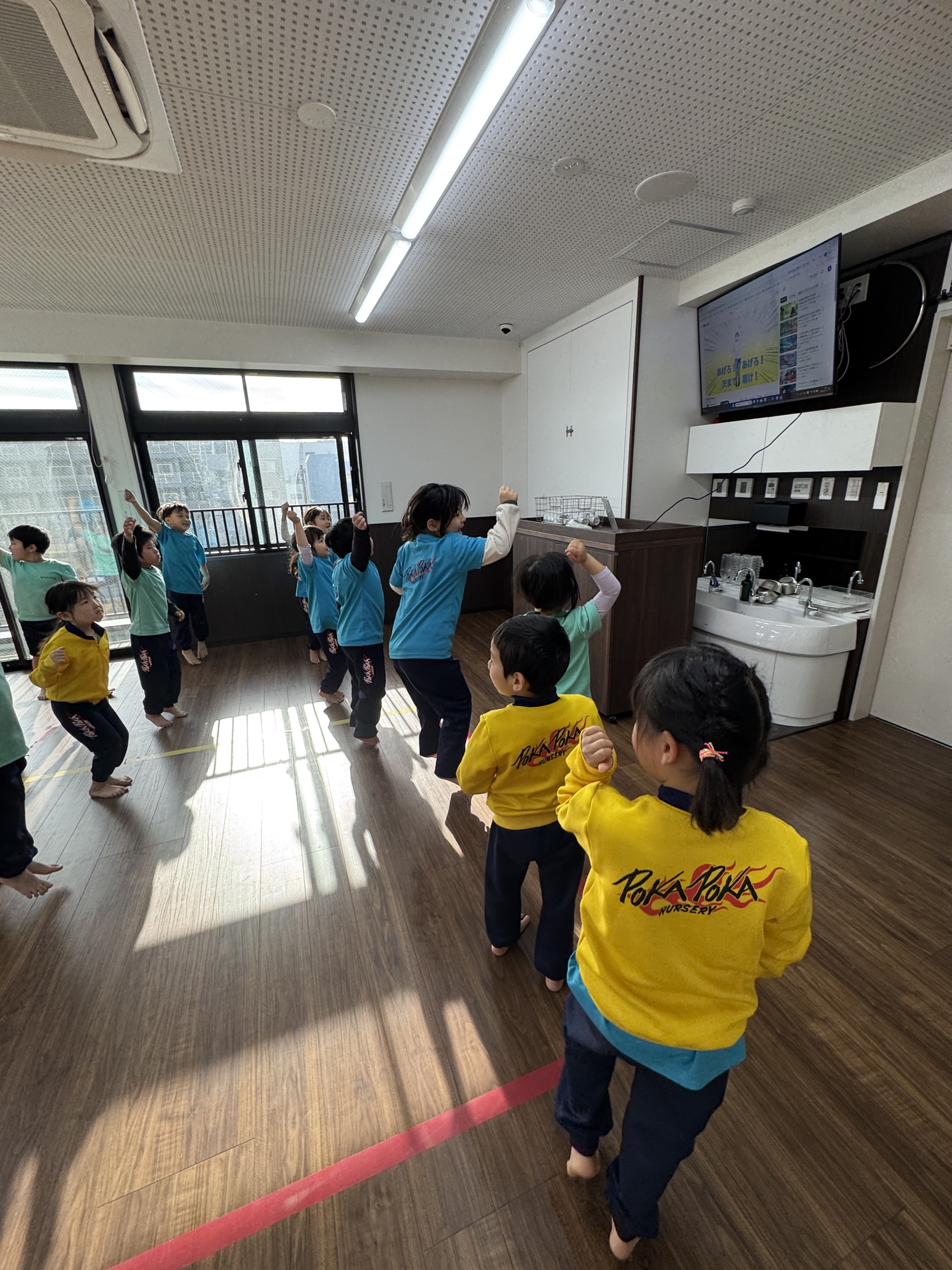 まずは朝の歌を元気良く歌って、踊って身体を慣らします♬