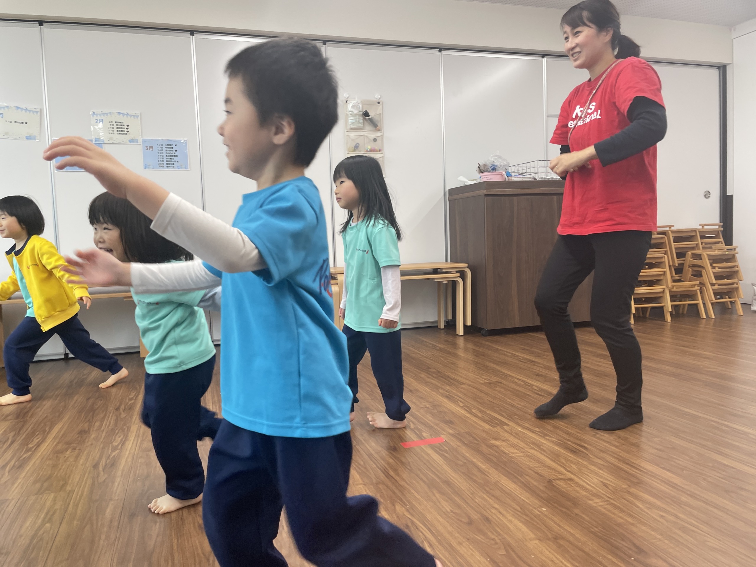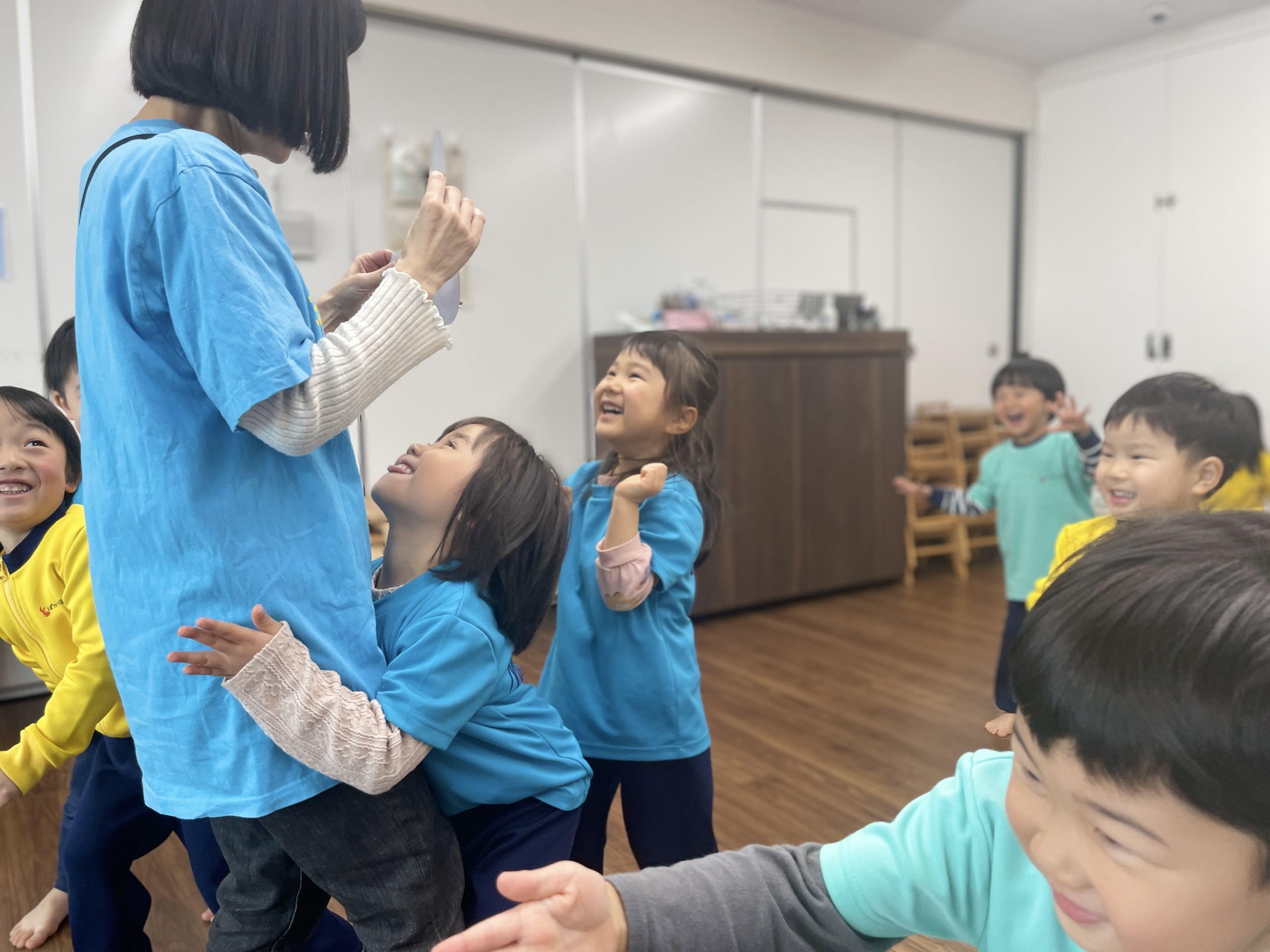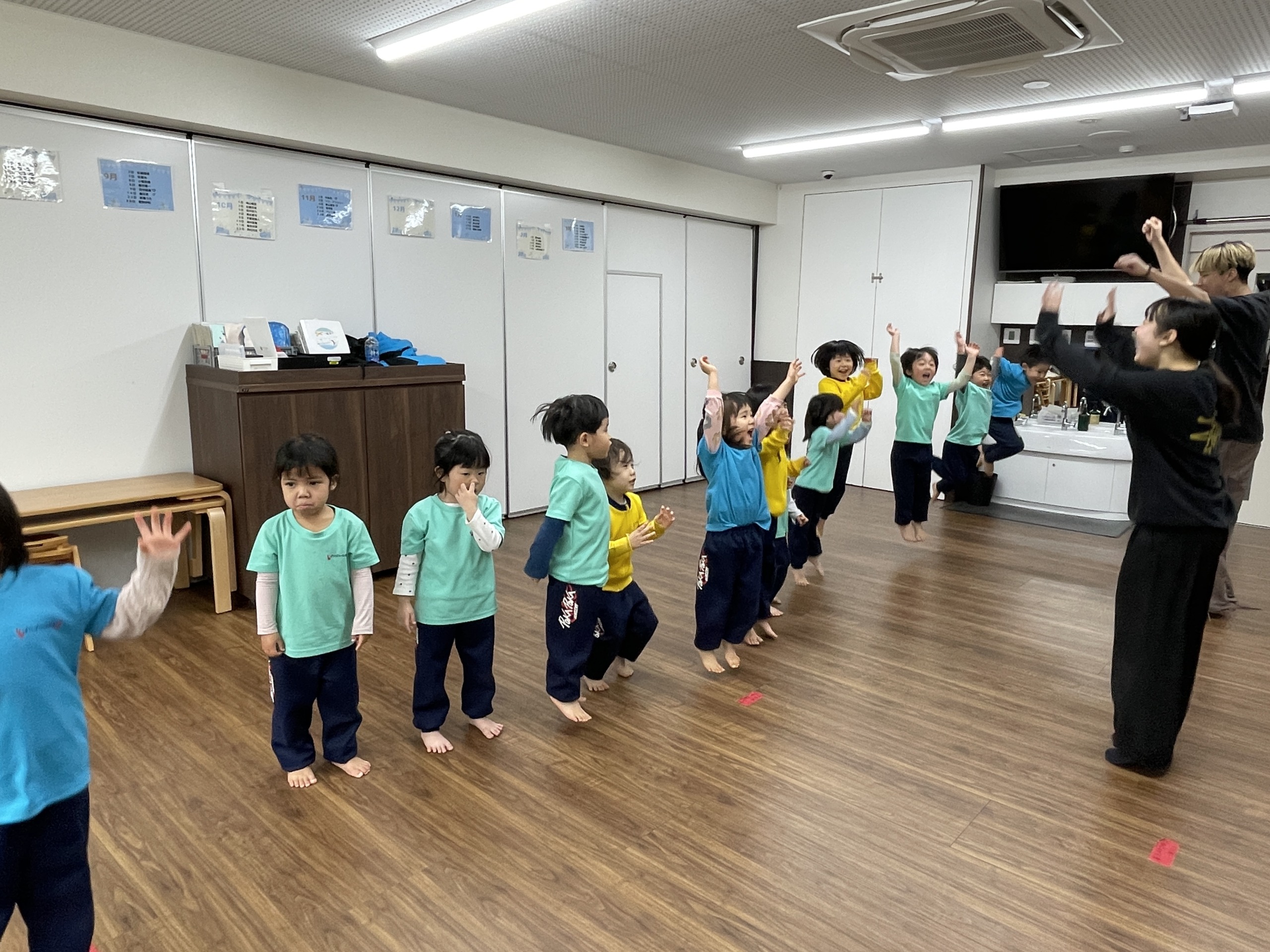 そして最後はダンスの時間。音楽が流れると、「しなこだ!」「ぼよよん!」と一気に表情が明るくなります。しなこの曲やぼよよん行進曲に合わせて、ジャンプしたり手を振ったり、全身を使って元気いっぱい踊りました。友だちの動きを真似したり、「一緒にやろう!」と声を掛け合ったりしながら、保育室は笑顔と笑い声でいっぱいに。体を動かすことで気持ちも発散され、心も体もすっきりした様子でした。