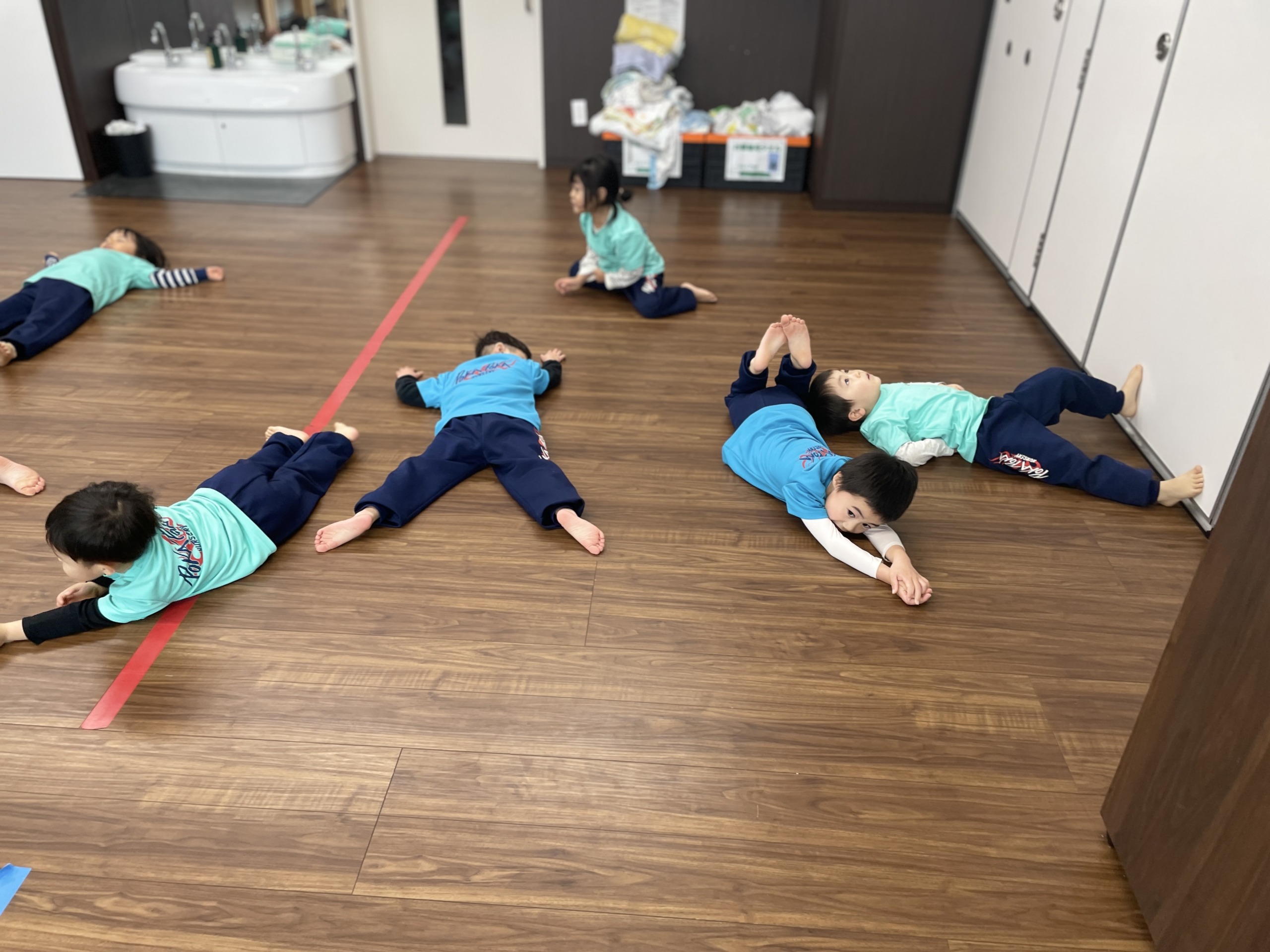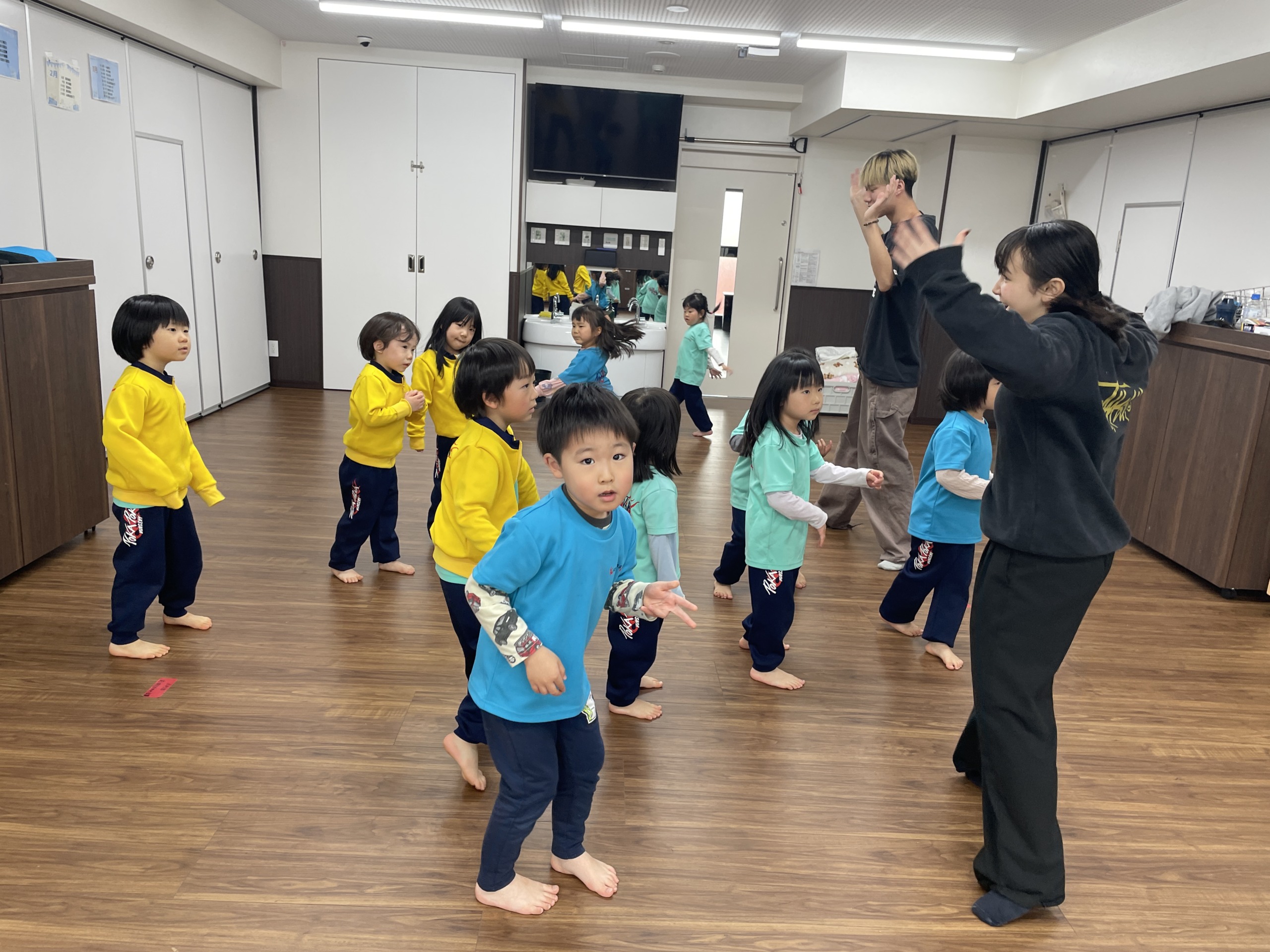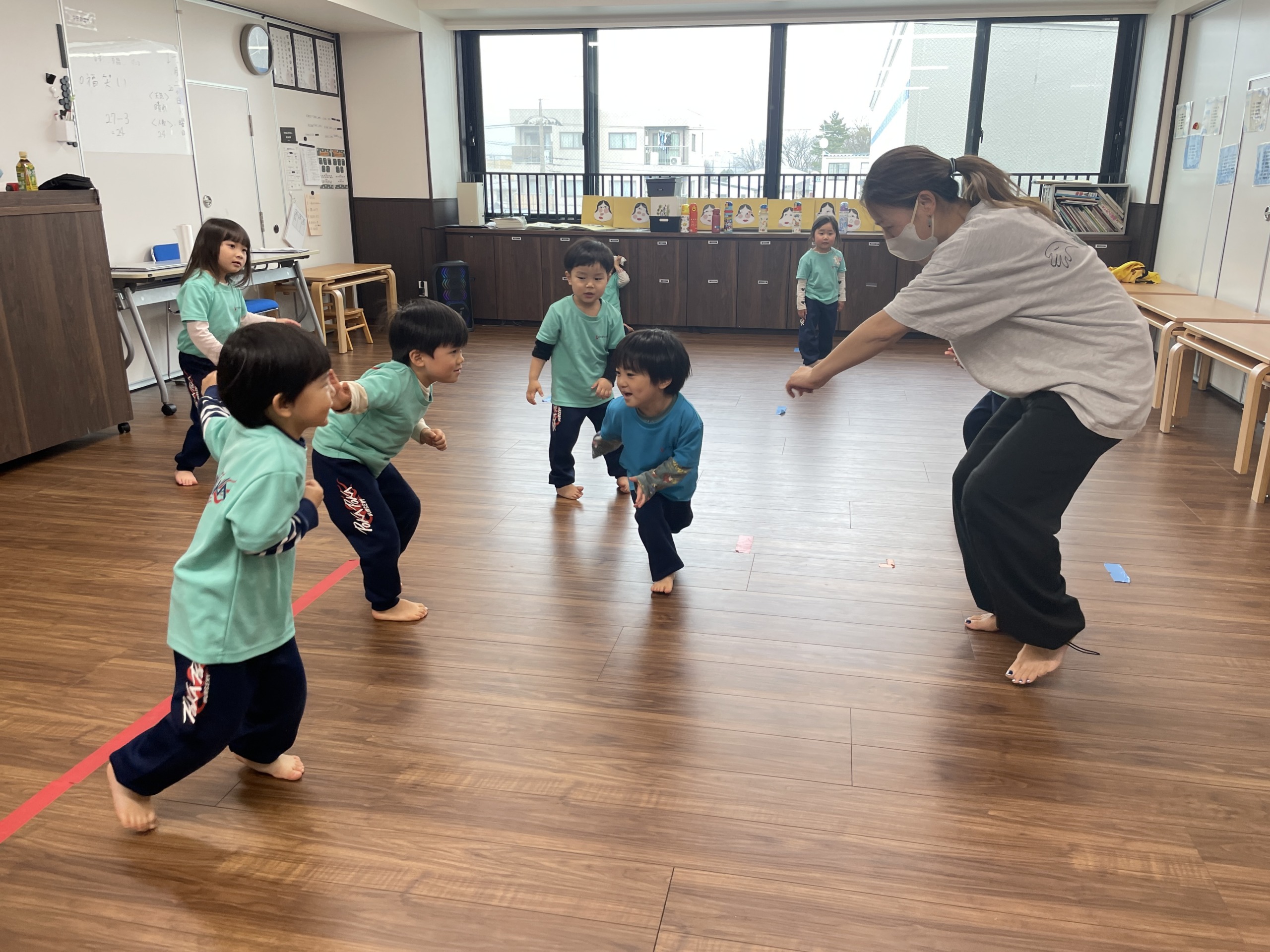 そして最後はダンスの時間。音楽が流れると、「しなこだ!」「ぼよよん!」と一気に表情が明るくなります。しなこの曲やぼよよん行進曲に合わせて、ジャンプしたり手を振ったり、全身を使って元気いっぱい踊りました。友だちの動きを真似したり、「一緒にやろう!」と声を掛け合ったりしながら、保育室は笑顔と笑い声でいっぱいに。体を動かすことで気持ちも発散され、心も体もすっきりした様子でした。