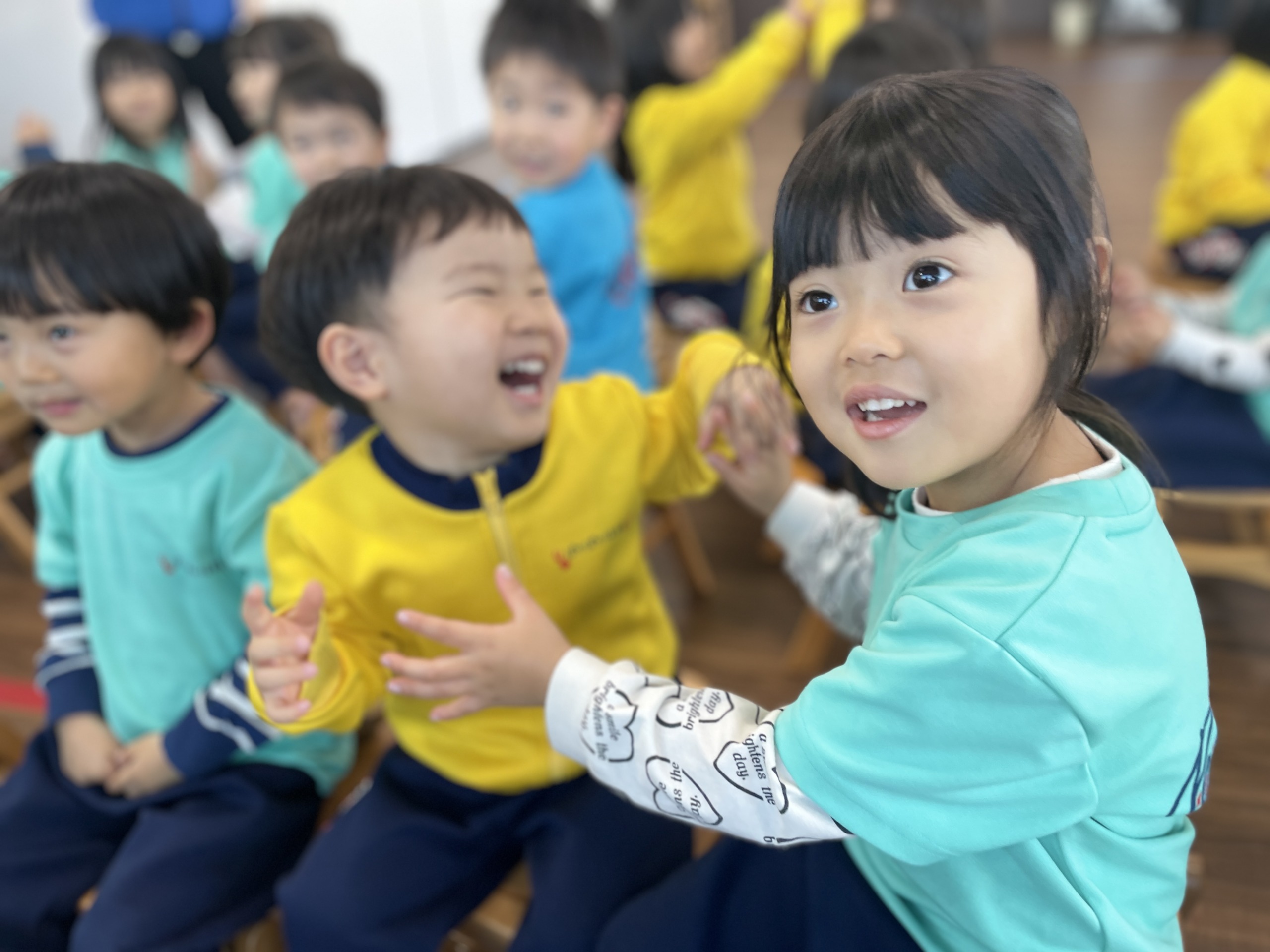 音楽に合わせて動くことで、リズム感や表現力だけでなく、「友だちと一緒に動く楽しさ」も感じている様子が見られました。誰かが動きを真似すると、「一緒だね!」と顔を見合わせて笑い合う姿もあり、音楽遊びの中で自然と関わりが深まっています。ぽかぽか保育園では、こうした音楽活動を通して、子どもの感性や表現する力を大切に育てています。これは幼児教育の中でも大切にしているカリキュラムの一つです。