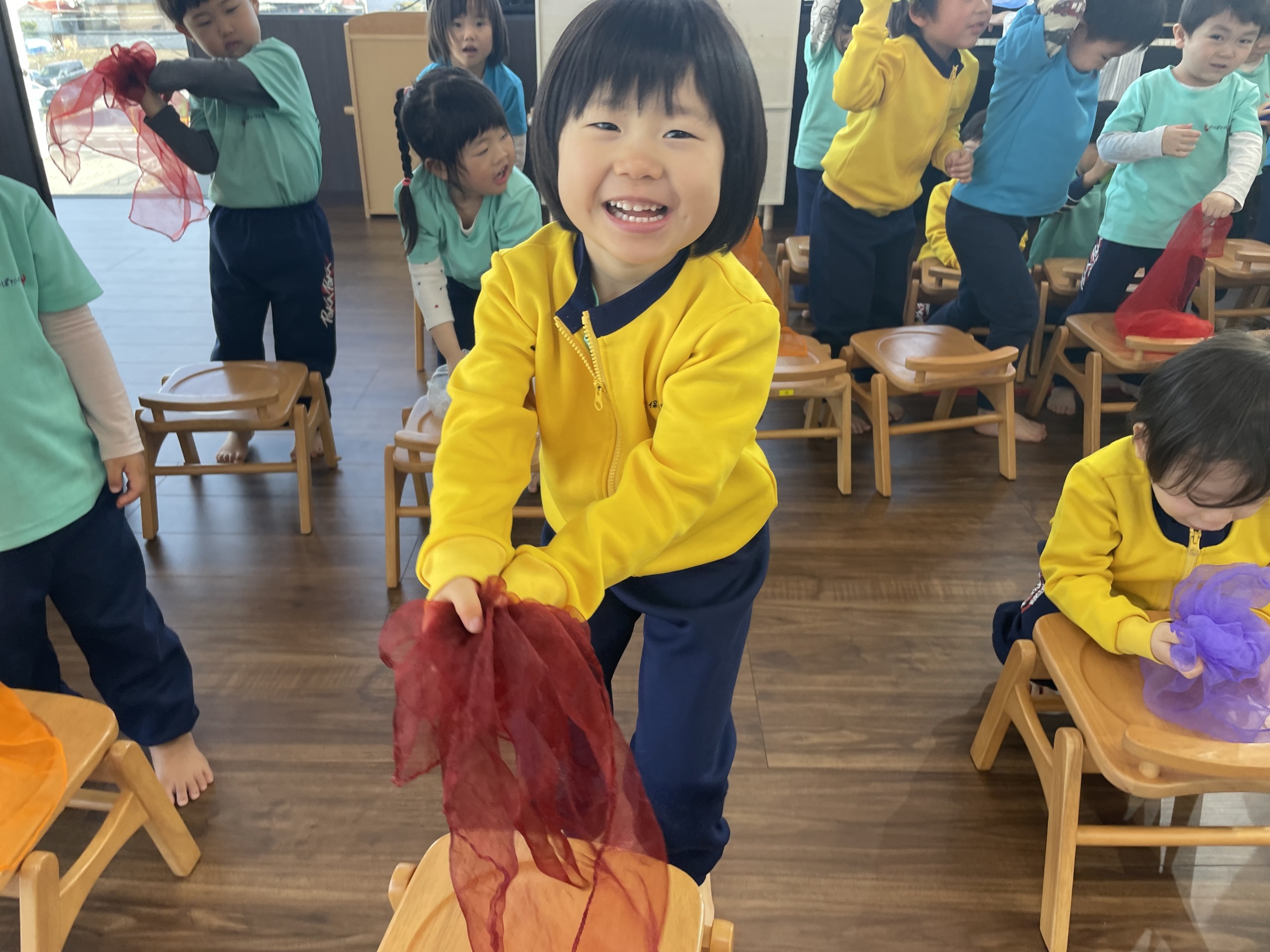 まずは音楽遊びからスタート。ピアノの音が鳴り始めると、「なにするの?」「音楽だ!」と自然と体が動き出します。今日はお餅つきをイメージしたリトミック。スカーフをお餅に見立てて、ぺったん、ぺったんとつく真似をしながら体を動かしました。「よいしょ!」「のびるよー!」と声を出しながら、音に合わせて動く子どもたち。スカーフがふわっと舞うたびに、「おもちみたい!」「やわらかそう!」と想像を膨らませ、全身で表現する姿がとても楽しそうでした。