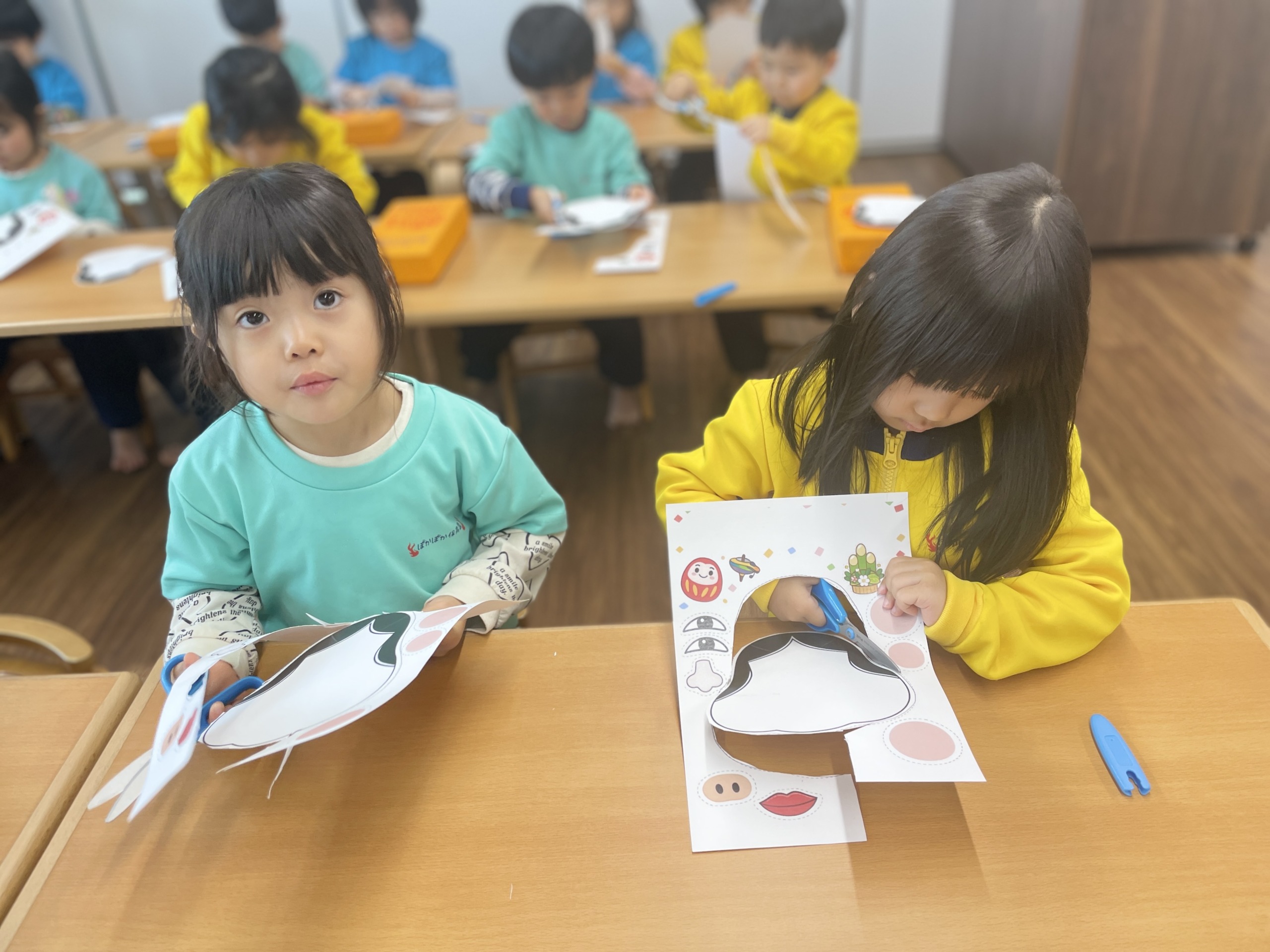 音楽遊びの後は、1月の制作「福笑い」に取り組みました。今回の制作のねらいは、もうすぐ四歳児に上がる子どもたちが、ハサミをより上手に使えるようになること。持ち方や力の入れ方を意識しながら、顔のパーツを切っていきました。先生が「ここを持つと切りやすいよ」「少しずつでいいよ」と声を掛けると、真剣な表情でハサミを動かす子どもたち。集中して取り組む姿に、大きな成長を感じました。