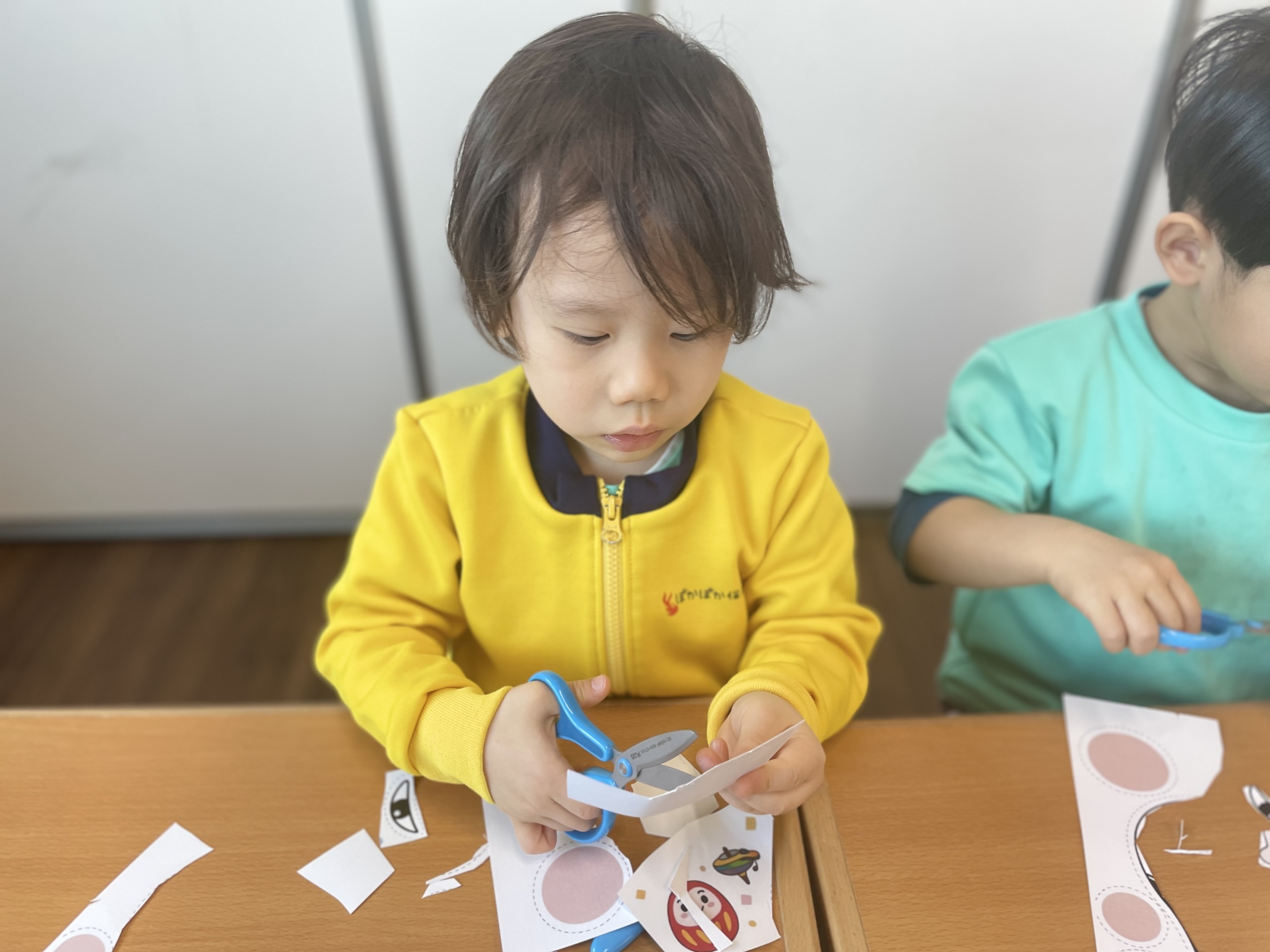 福笑いでは、切ったパーツを自由に並べて顔を完成させます。「ここかな?」「へんなかお!」と笑い合いながら貼っていく時間も、子どもたちにとって大切な学びのひとつです。自分で考え、試し、表現する。その積み重ねが、次のステップへとつながっていきます。四歳児になったとき、みんなが「ハサミ、できるよ!」と自信を持って言えるよう、これからも丁寧に関わっていきたいと思います。