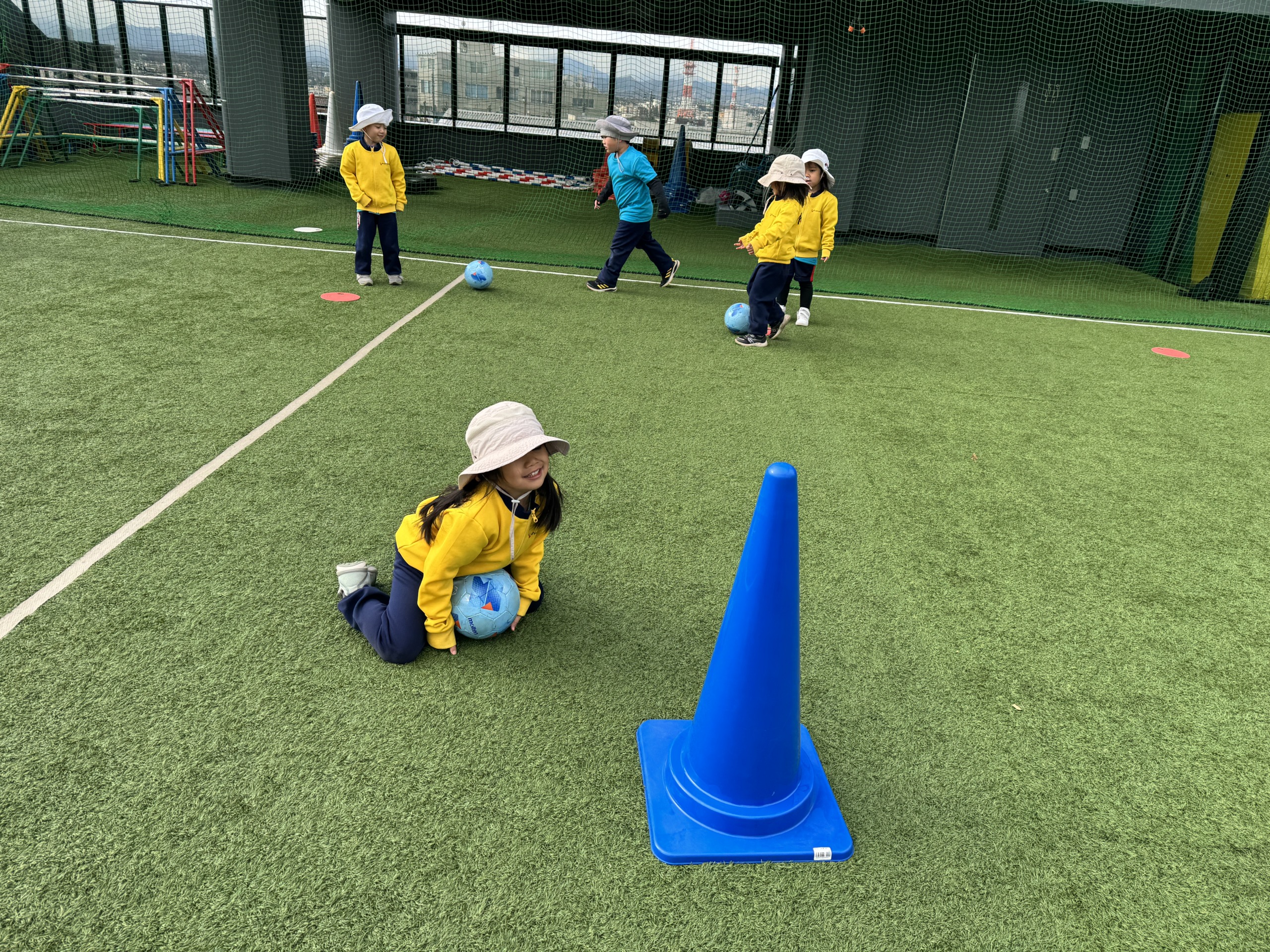 自由にボールで遊んだ後にゲームをしました!名付けてコーン当てゲームです。順番にボールをコーンに向けて蹴ります。