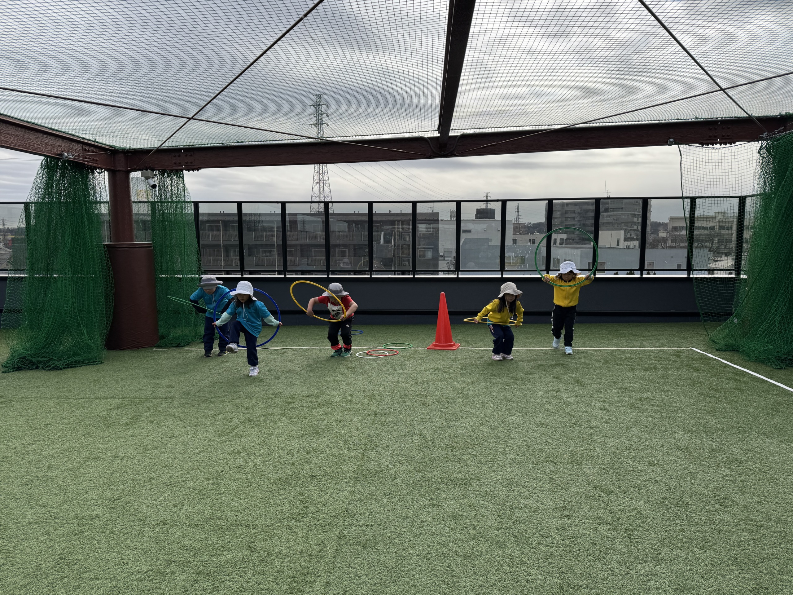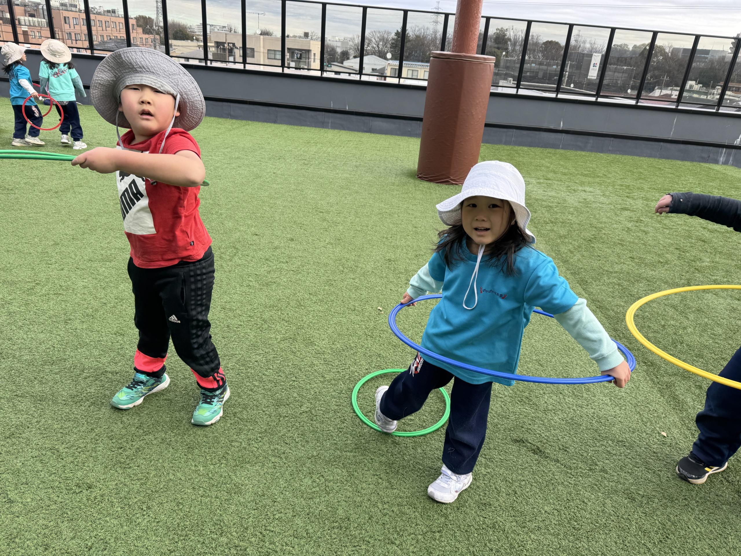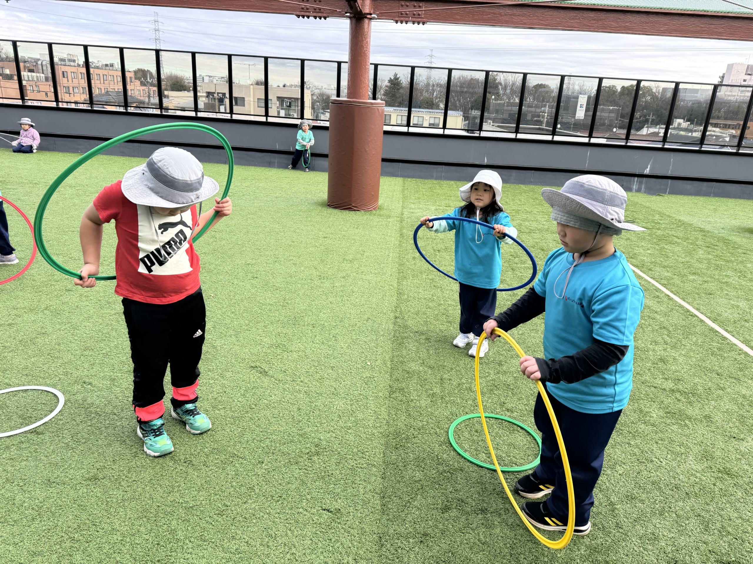 次はフラフープを出すことに。まずは正しい使い方を実演しながら見せていきます!遊具の正しい使い方をしっかりと伝える事で子どもたちの遊びの幅が広がっていきます。今回は「腰で回す」「フラフープ跳び」を伝えました。