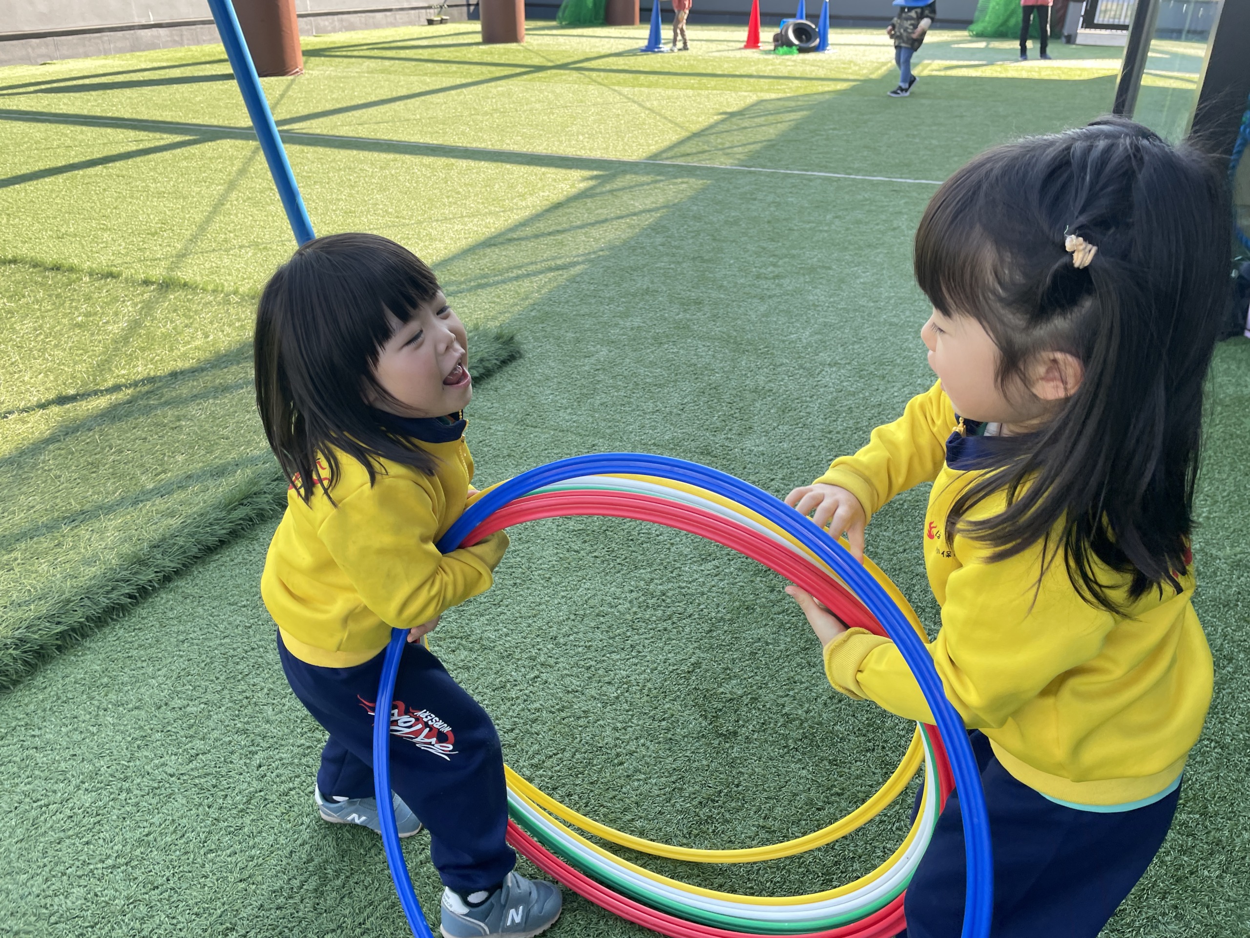 サイエンスの後は、年齢ごとに活動を分けて戸外遊びへ。3歳児はグレープシードの時間があったため、その前に屋上で体を動かしました。寒さに負けず走り回り、「まてまてー!」「つかまえた!」と元気な声が響きます。屋上という安心できる環境の中で、思いきり体を動かし、心も体もぽかぽかになりました。
