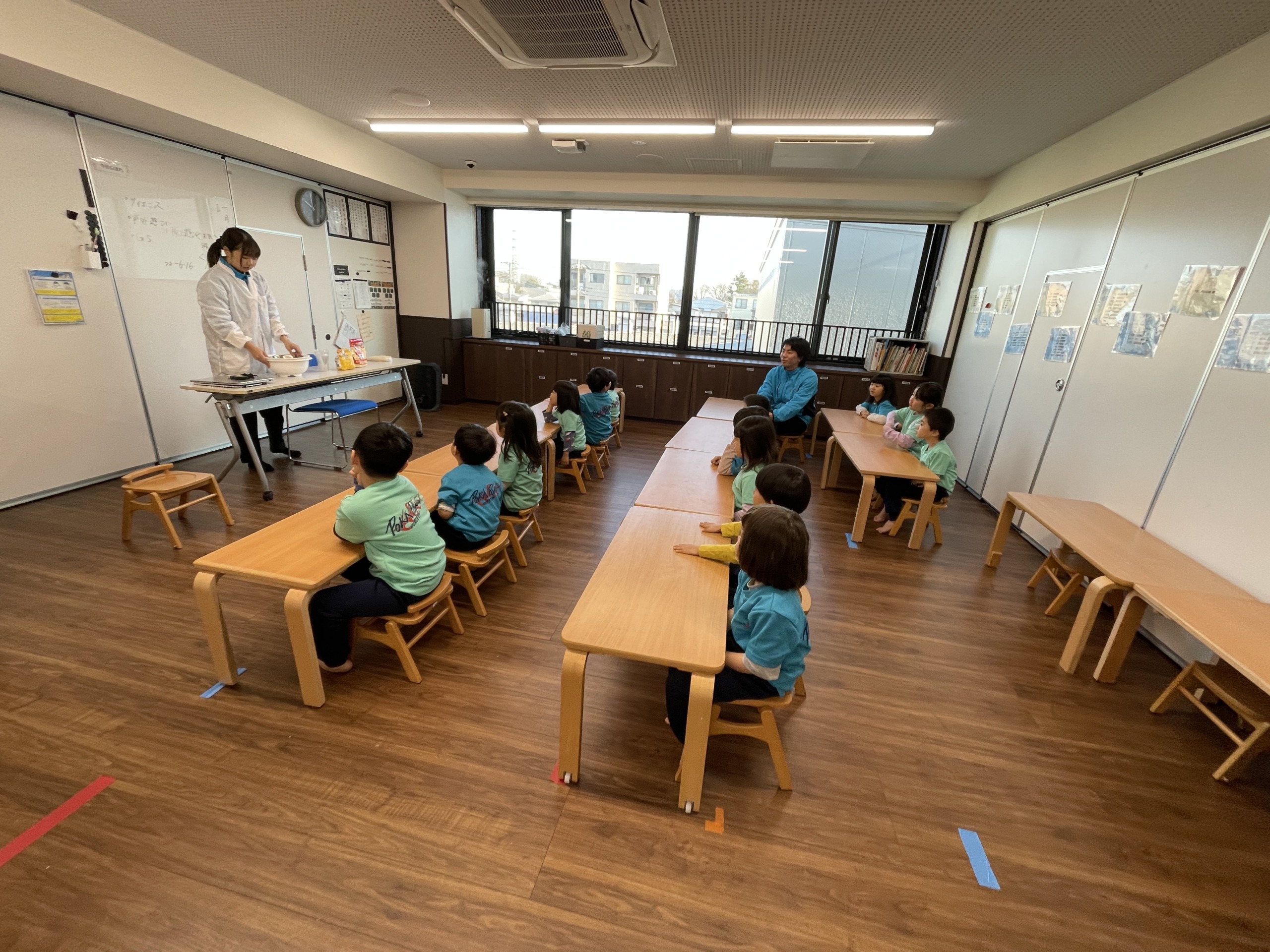 今日のぽかぽか保育園は、朝から気持ちのいい晴れ空。屋上に差し込む冬の太陽が心地よく、「今日もいい天気だね」「お外行ける?」と、子どもたちは元気いっぱいに登園してきました。今日は日曜日に予定しているお餅つきに向けて、予行練習としてサイエンスの時間に“お餅づくり体験”を行いました。
