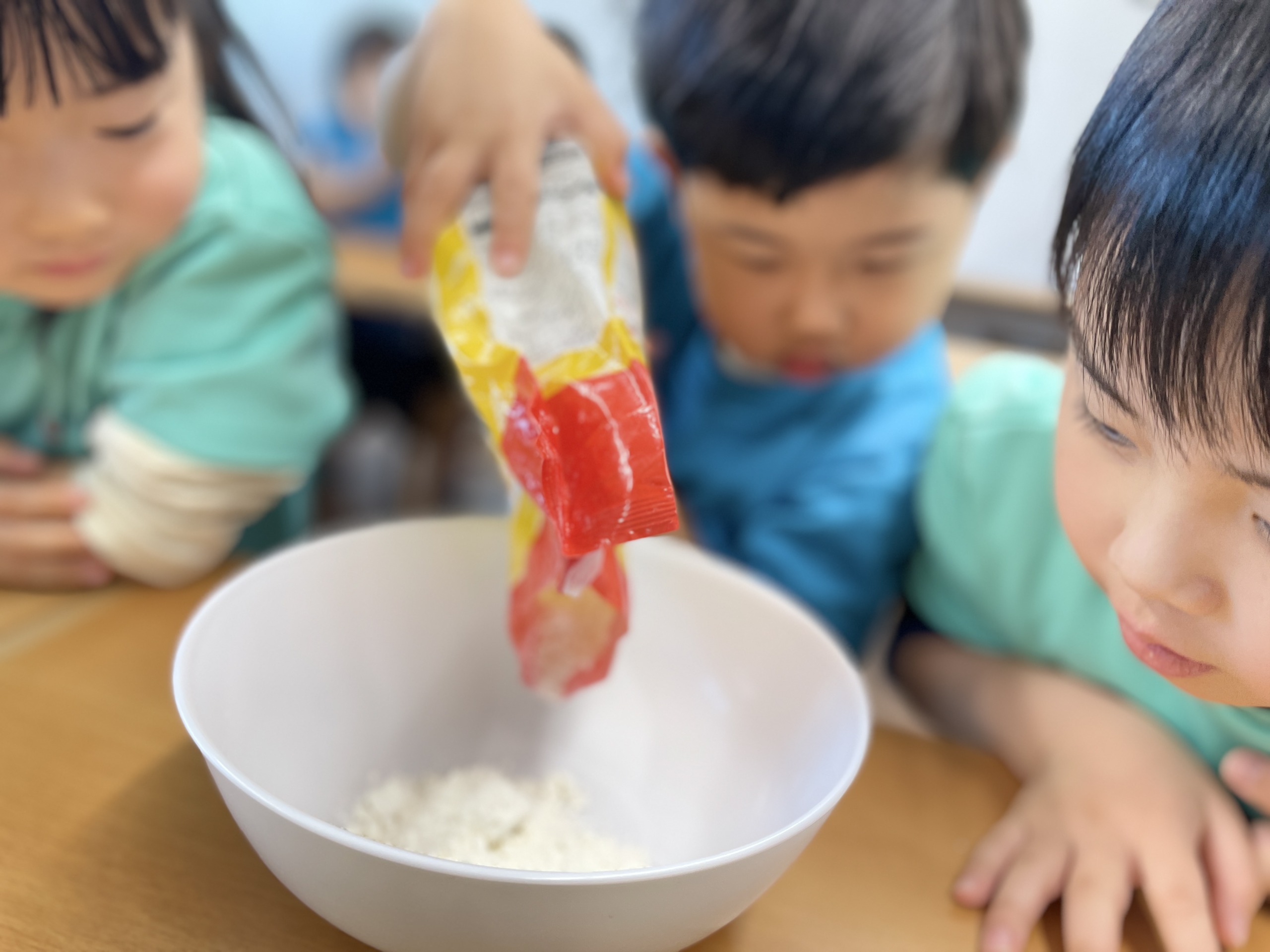 サイエンスの時間では、「今日はお餅を作ってみよう」と話すと、「え!お餅?」「食べるの?」と目をキラキラさせる子どもたち。実際のお餅ではなく、小麦粉粘土を使った体験でしたが、粉から変化していく様子をしっかり感じられる内容です。最初はサラサラだった粉に少しずつ水を入れて混ぜていくと、「あれ?」「なんか変わってきた」と不思議そうな表情に変わっていきました。