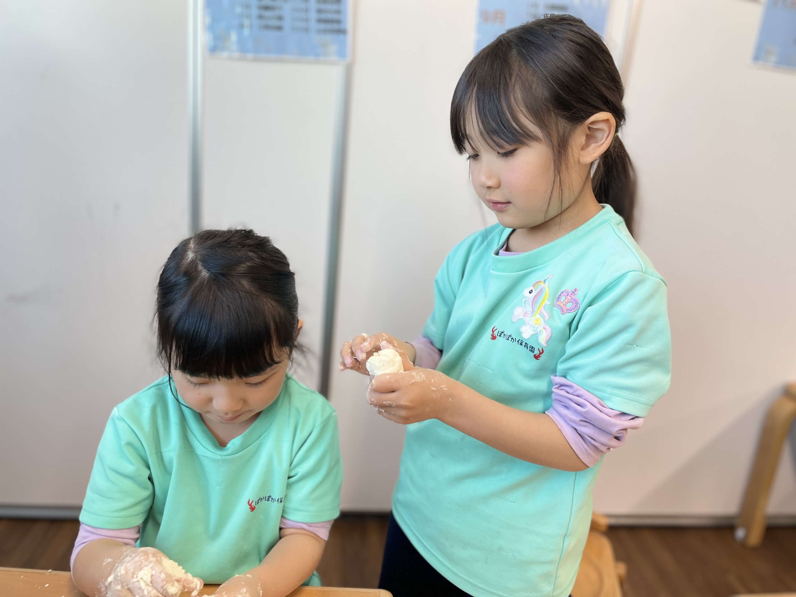 こねていくうちに、「手にくっつく!」「やだー、ベタベタ!」と声が上がる一方で、「でもお餅みたい」「のびるよ!」と、触感の変化を楽しむ姿も見られました。先生が「さっきと今、どう?」と聞くと、「さっきは粉だったのに」「今は固まってきた!」と、変化に気づき言葉にする子どももいました。「お餅になった!」「すごい!」と、自分の手で作り上げた感覚をしっかり味わい、日曜日のお餅つきがさらに楽しみになったようです。