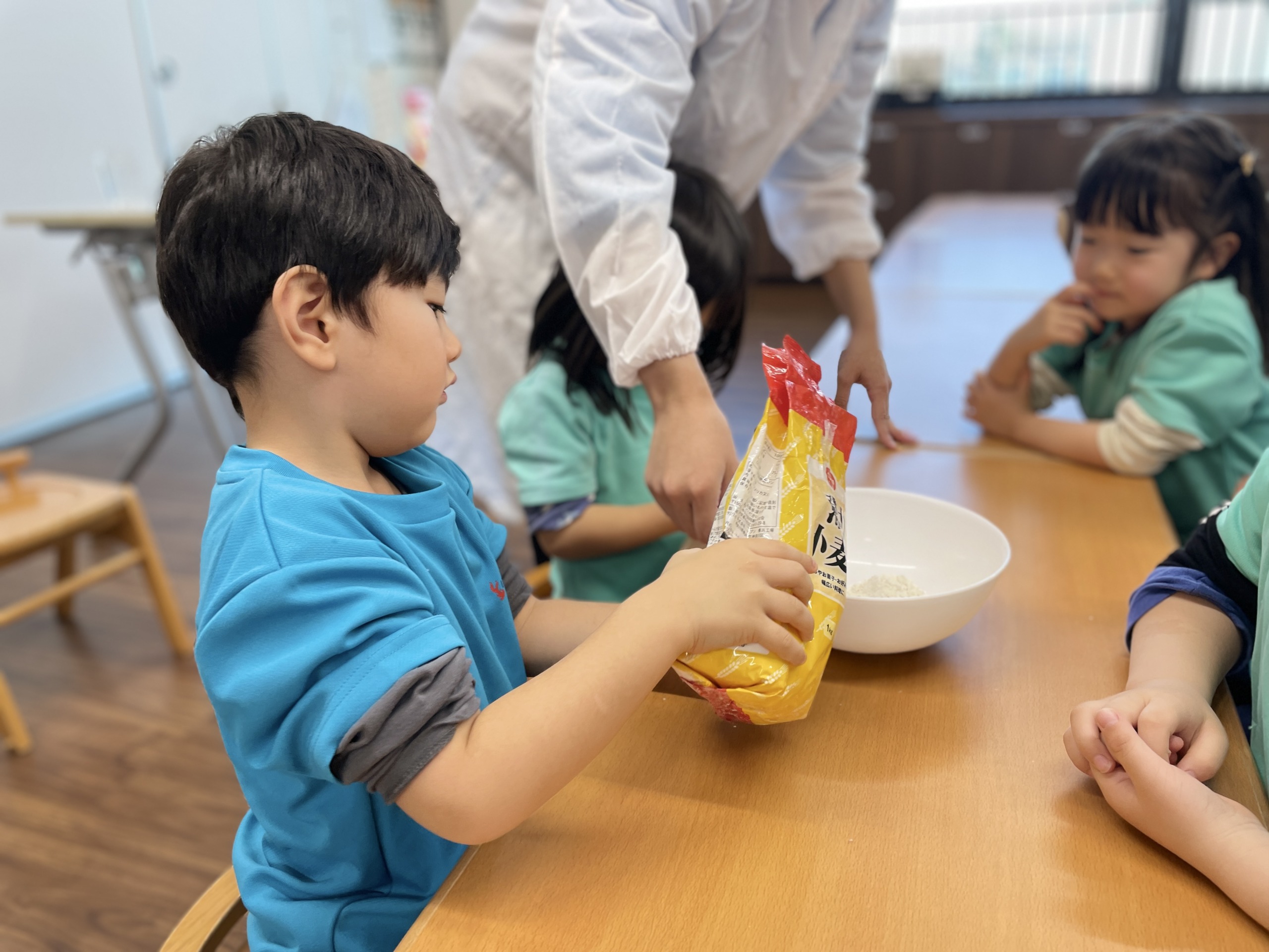 サイエンスの時間では、「今日はお餅を作ってみよう」と話すと、「え!お餅?」「食べるの?」と目をキラキラさせる子どもたち。実際のお餅ではなく、小麦粉粘土を使った体験でしたが、粉から変化していく様子をしっかり感じられる内容です。最初はサラサラだった粉に少しずつ水を入れて混ぜていくと、「あれ?」「なんか変わってきた」と不思議そうな表情に変わっていきました。