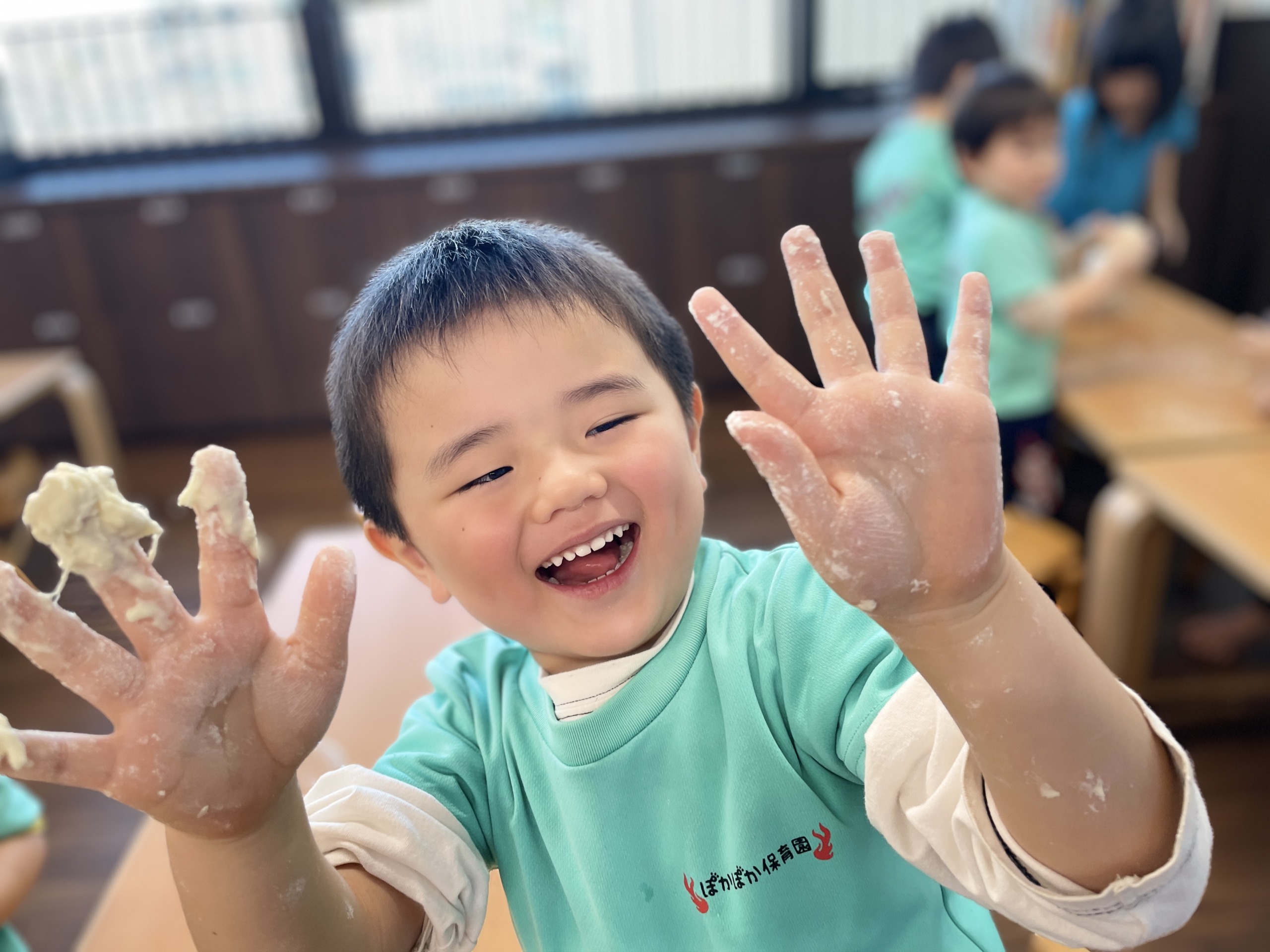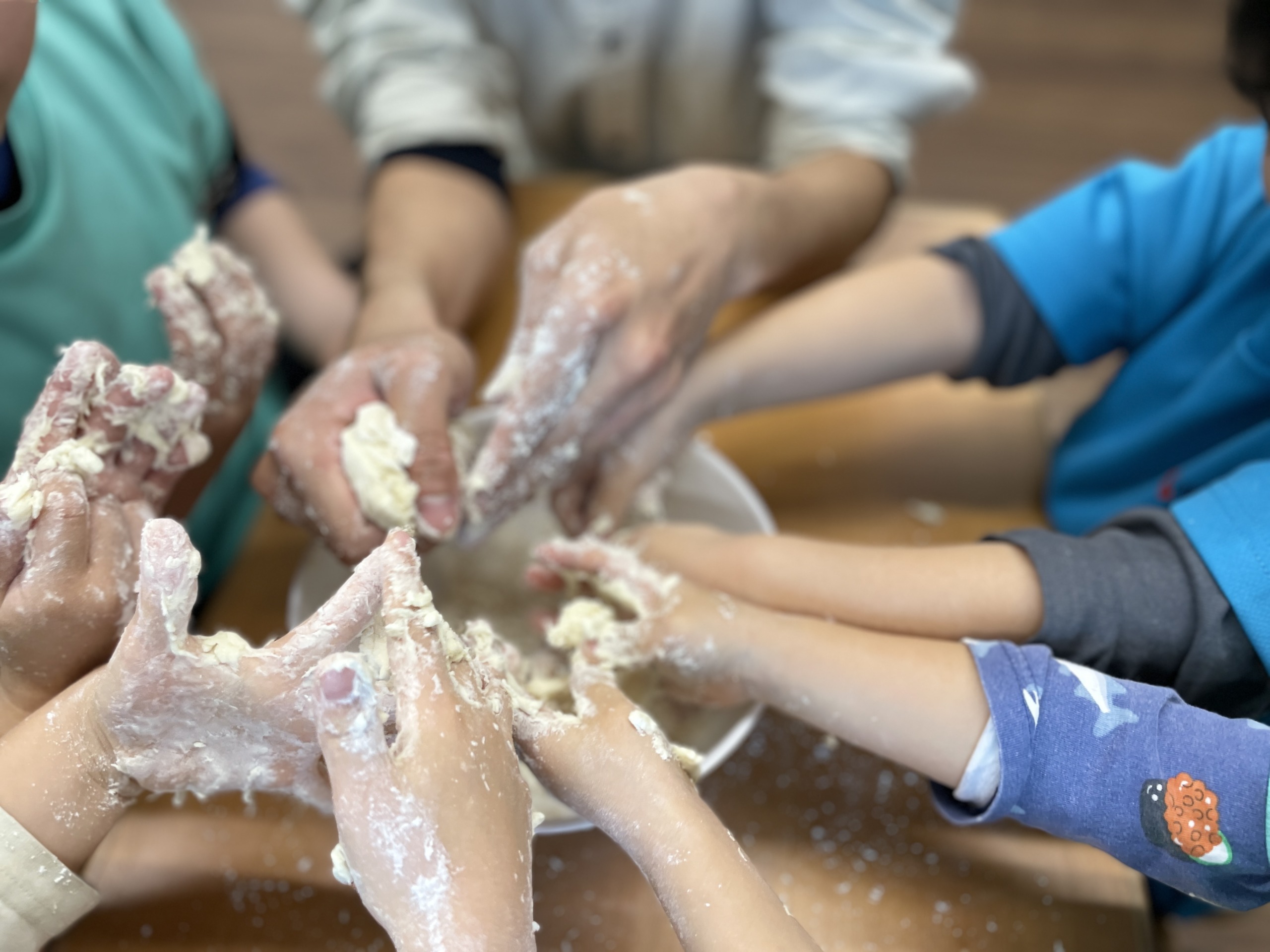 こねていくうちに、「手にくっつく!」「やだー、ベタベタ!」と声が上がる一方で、「でもお餅みたい」「のびるよ!」と、触感の変化を楽しむ姿も見られました。先生が「さっきと今、どう?」と聞くと、「さっきは粉だったのに」「今は固まってきた!」と、変化に気づき言葉にする子どももいました。「お餅になった!」「すごい!」と、自分の手で作り上げた感覚をしっかり味わい、日曜日のお餅つきがさらに楽しみになったようです。