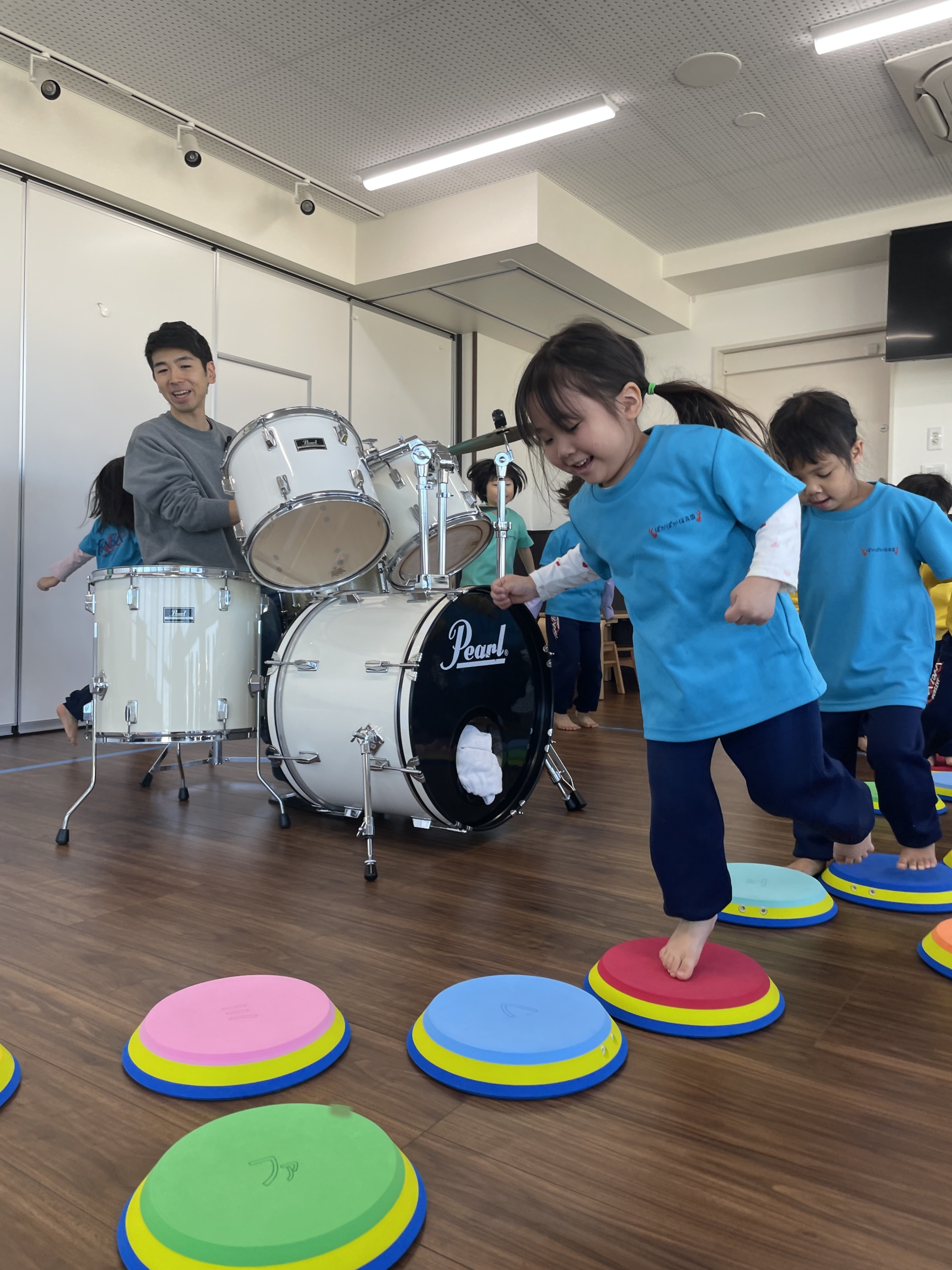 ドンドンと響く音に合わせて体を揺らしたり、ジャンプしたり、自然と全身で表現する子どもたち。