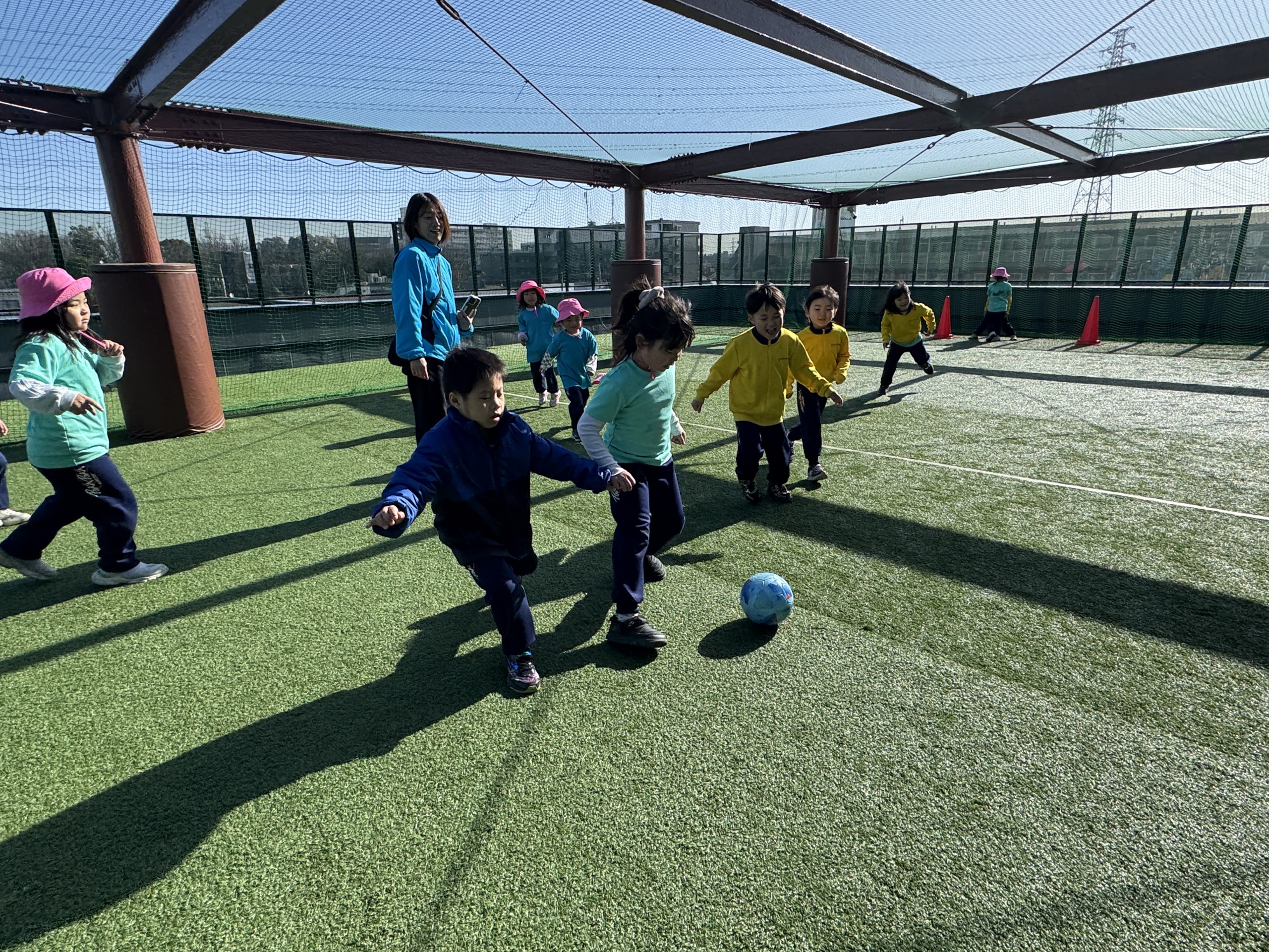 サッカー遊びでは、ボール操作に戸惑いながらも「もう一回やりたい!」と何度も挑戦。