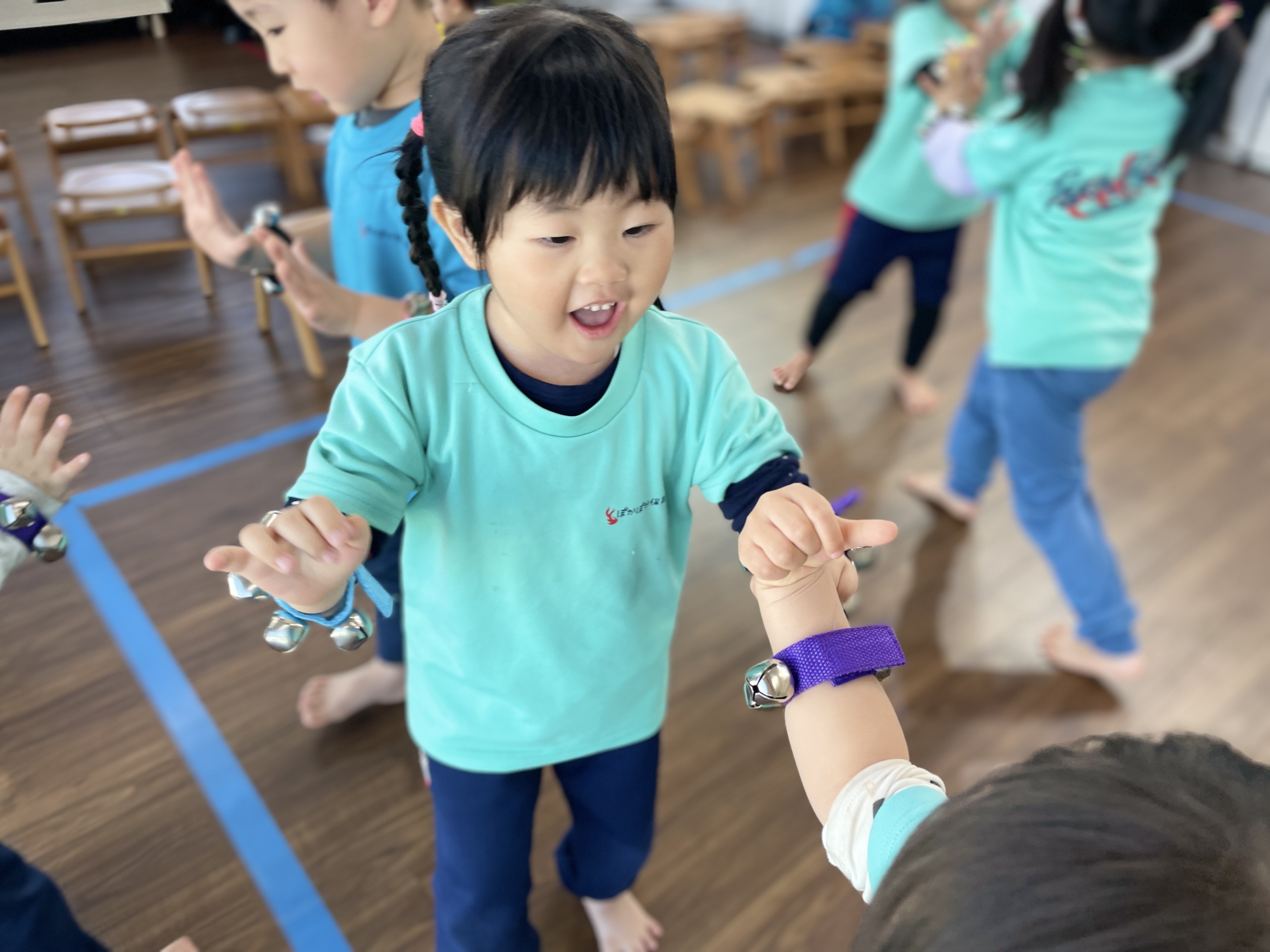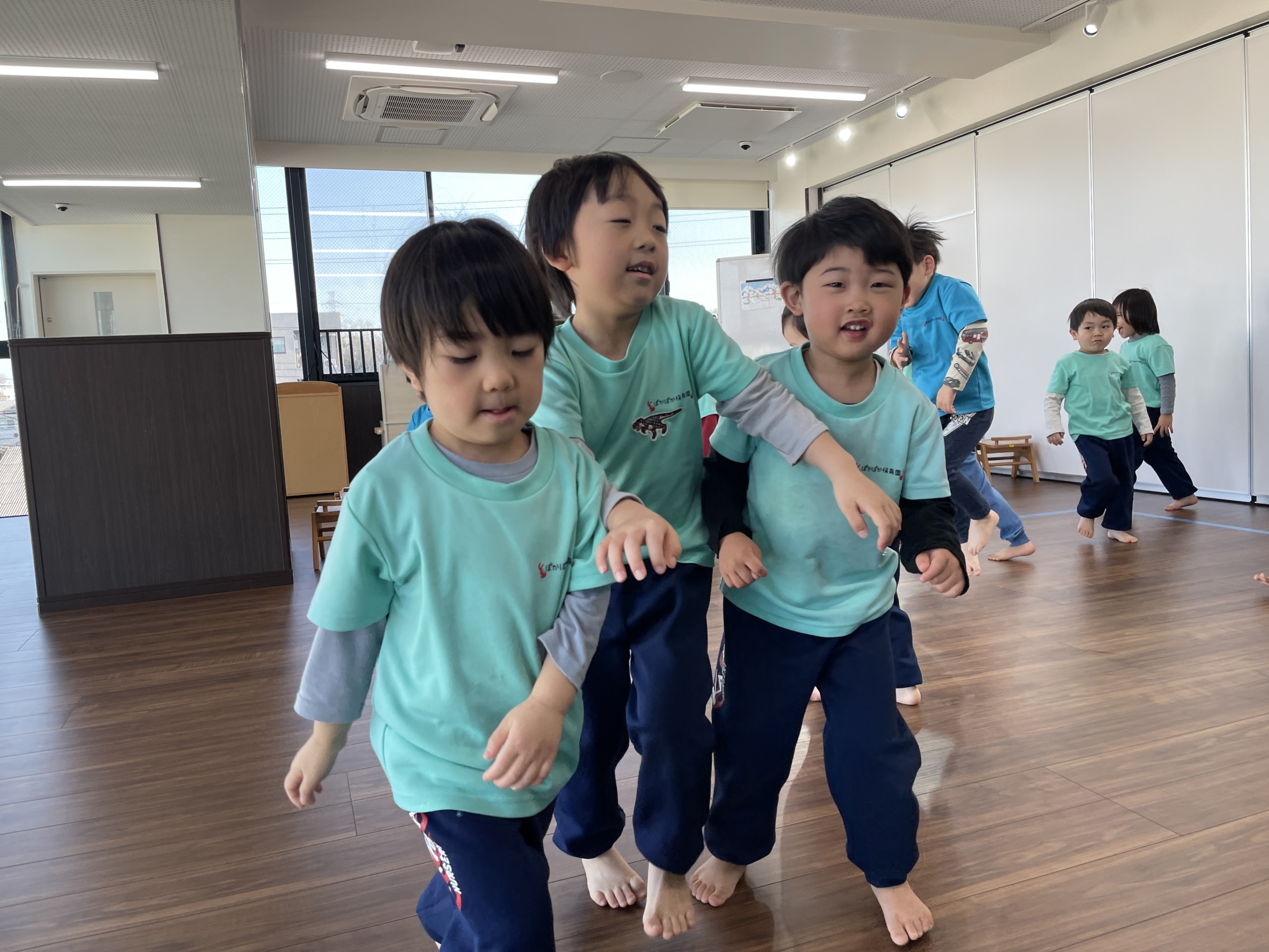 その後は、いつもの“しなこ”のダンス。音楽が流れた瞬間からノリノリで、「ここだよね!」「まわるんだよ!」と、覚えた振り付けを思い出しながら踊る子どもたち。体を動かすことで気持ちも発散され、保育室は笑顔と笑い声でいっぱいになりました。ダンスを通して、リズム感や体の使い方だけでなく、友だちと一緒に楽しむ力も育っています。