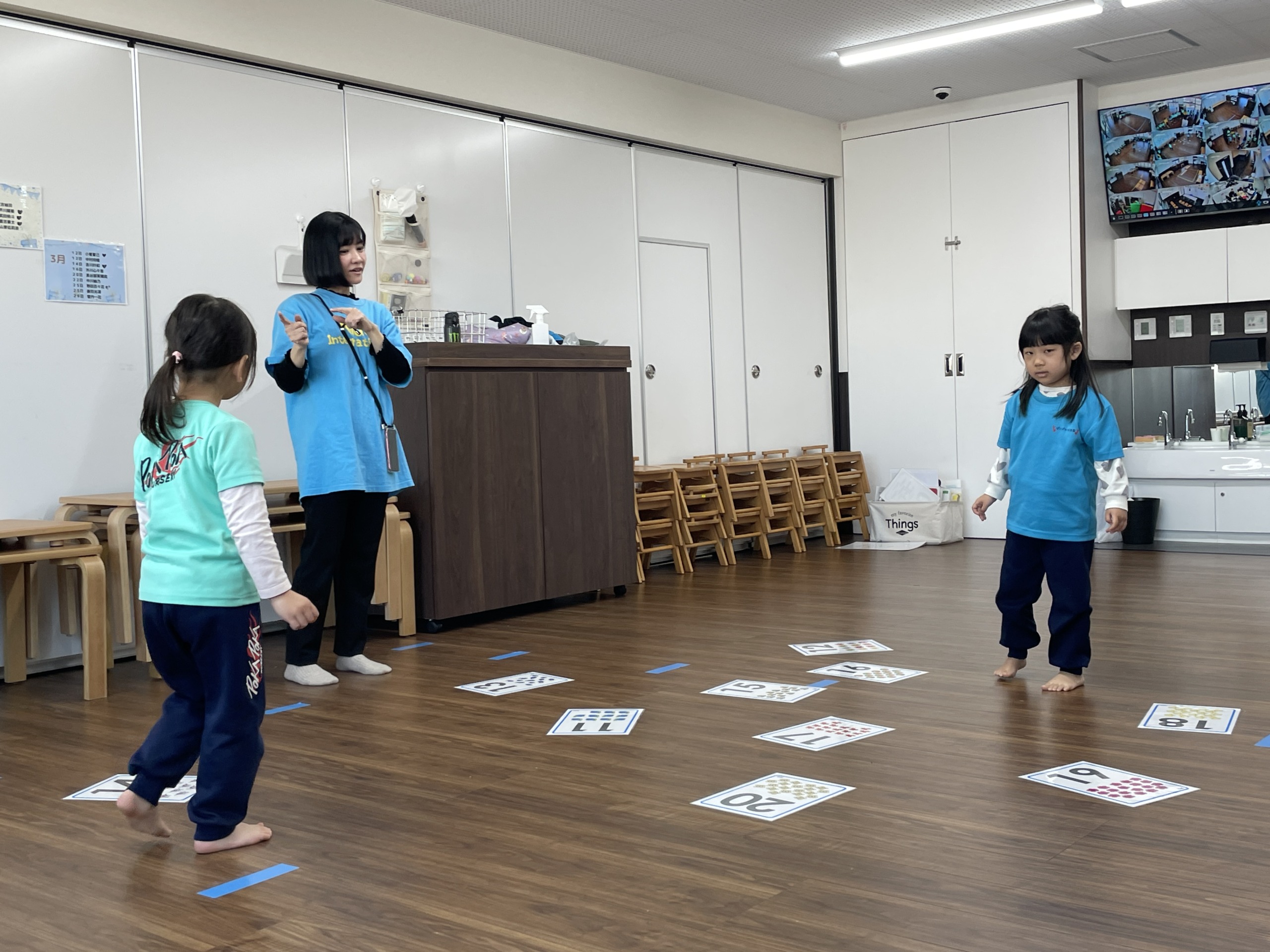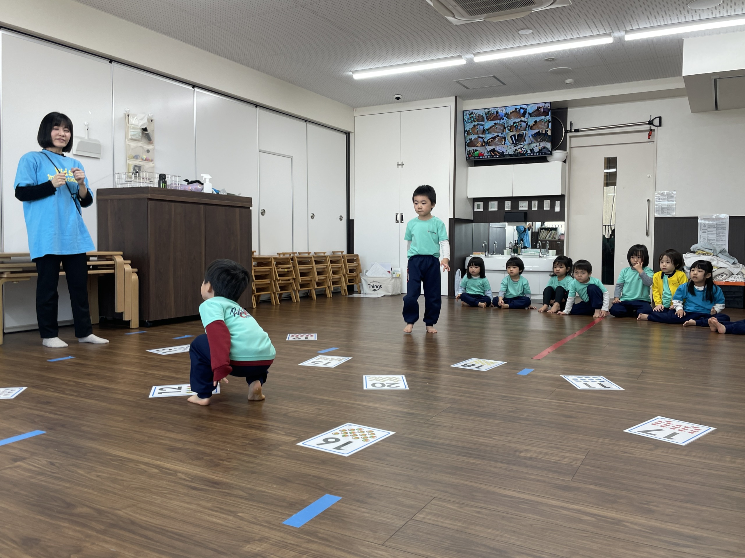 音楽の後は、英語の時間です。今日は11〜20の数字を英語で楽しく学びました。「eleven!」「twelve!」と、歌やリズムに合わせて声に出しながら覚えていきます。「むずかしい!」と言いながらも、「もういっかい!」と繰り返し楽しむ姿が印象的でした。先生が「じゃあ、いくつかな?」と聞くと、「えっと…thirteen!」と答えようとする子もいて、少しずつ数字への興味が広がっています。