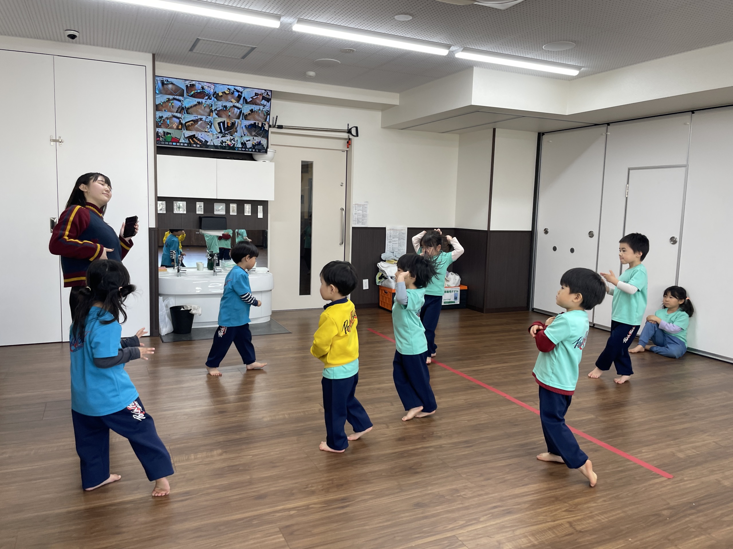 「ここはこうだよ」「つぎ、てをあげるんだよ」と、友だち同士で確認し合う姿も見られ、「前よりじょうず!」と褒め合う場面もありました。先生が「大きな声でうたってみよう」と声を掛けると、ちょっぴり照れながらも、一生懸命声を出す子どもたち。完璧でなくても、楽しみながら表現することを大切にしています。