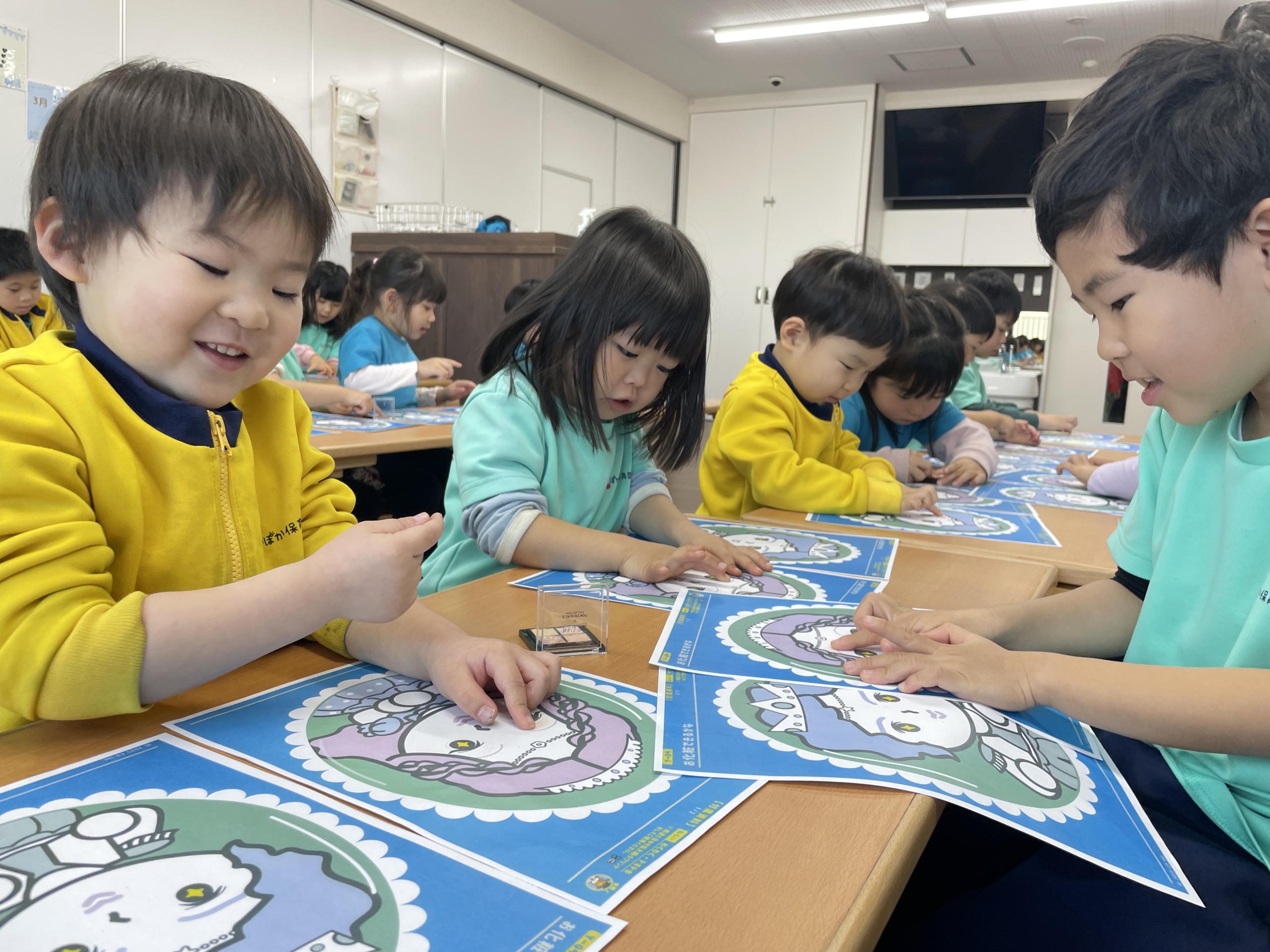 「この色かわいいね」「ここにぬったらどうなるかな?」と、自然と会話が生まれ、子ども同士で見せ合いながら楽しむ姿が見られました。4歳児や5歳児は色の組み合わせを考えたり、「男の子だからこの色にしようかな」と相手をイメージして工夫する様子もあり、幼児教育の中で大切にしている“考える力”や“表現する力”がしっかり育っていることを感じました。