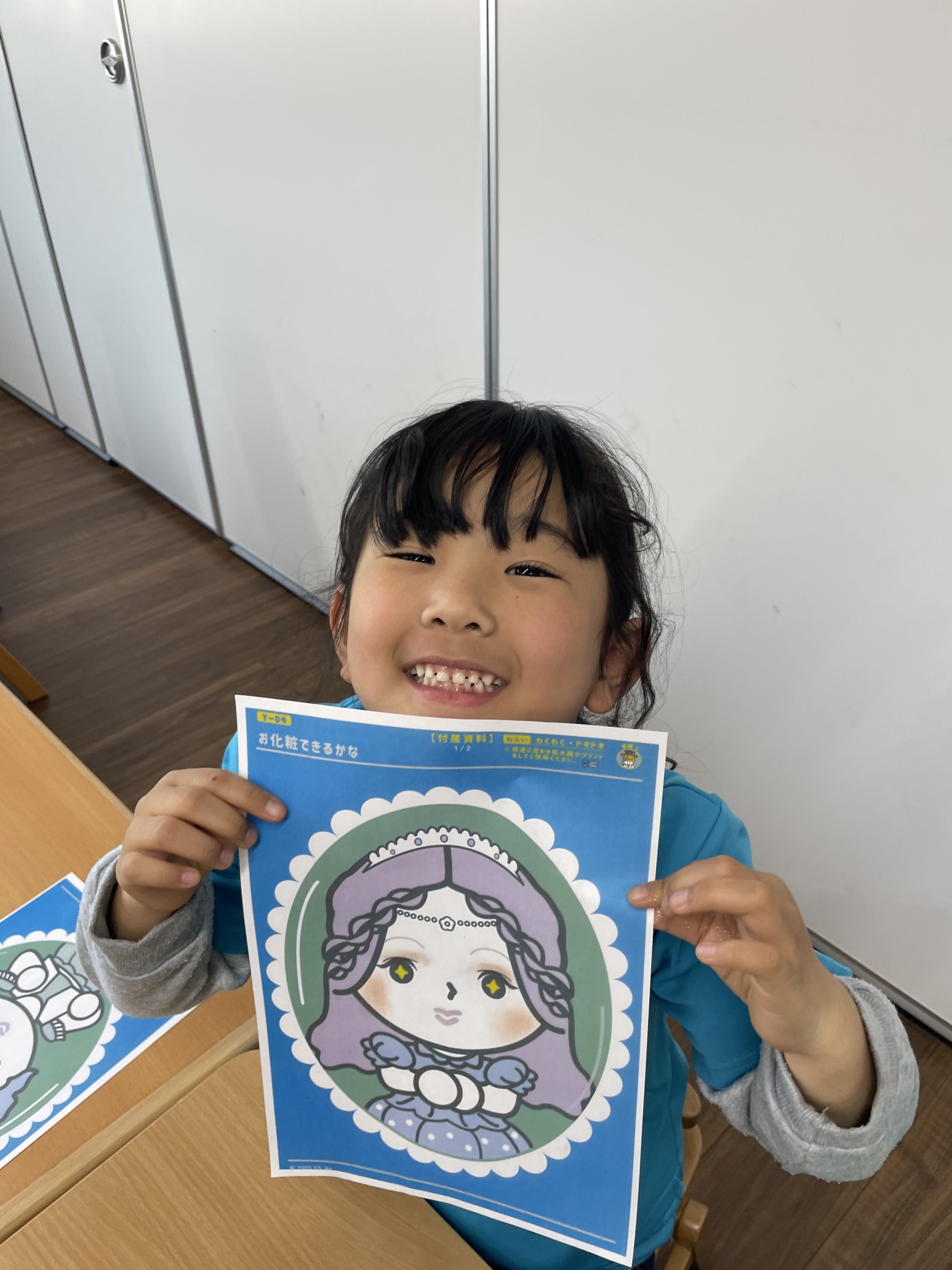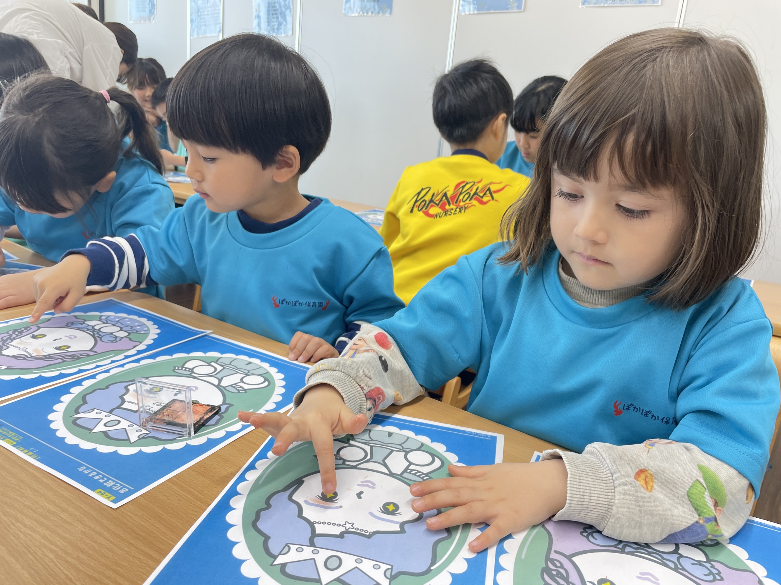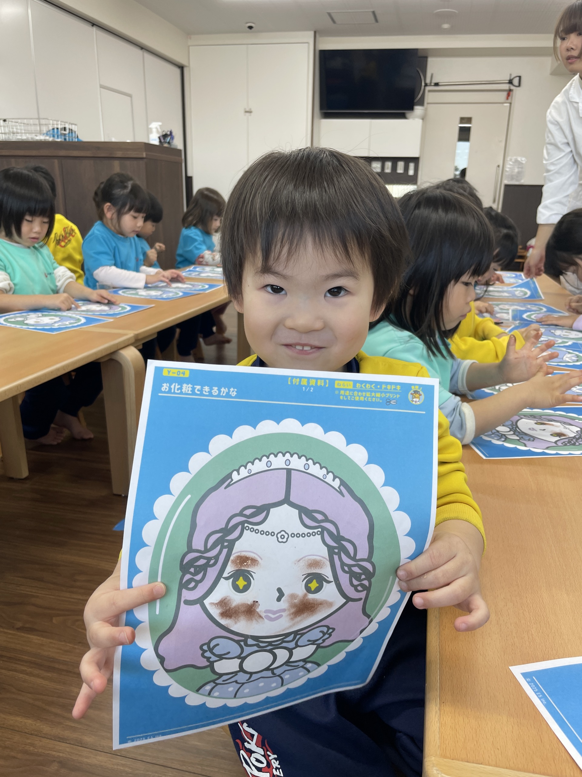 この日のメイン活動は、子どもたちに大人気のサイエンスでした。今回は少し変わった素材として、アイシャドウを使った活動に挑戦しました。机の上に紙で描かれた、男の子や女の子の顔を用意し、「今日はお化粧をしてみよう」と伝えると、子どもたちは目をキラキラさせながら「えー!やりたい!」「どの色にしようかな」と興味津々でした。