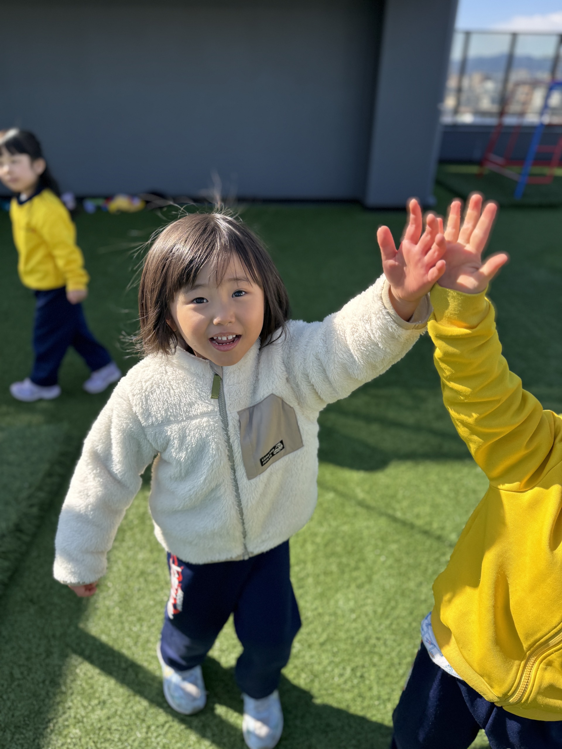 サイエンスが終わった後は、年齢ごとに活動を分けて過ごしました。3歳児はグレープシードの時間を楽しみ、その後はドリームのお友達と一緒に屋上へ出ました。普段とは少し違うメンバーで過ごす時間に、最初は少し緊張している様子もありましたが、鬼ごっこや走り回るうちに自然と距離が縮まり、笑顔が増えていきました。