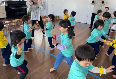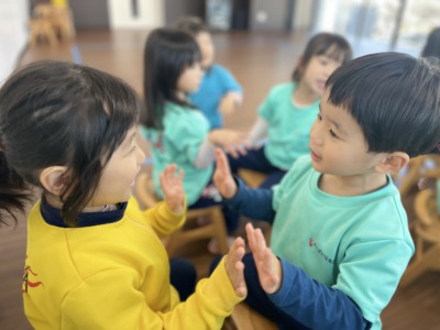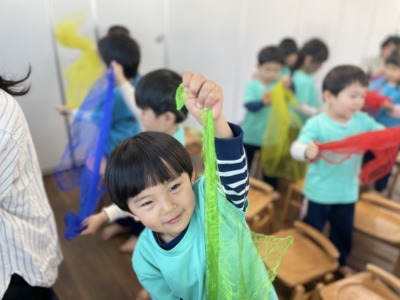 一緒に顔を見合わせてリズムを奏でたり、音を出したり☆協調性を育んでいく3歳児クラスのみんなです!