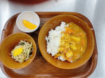 玉ねぎ・人参・豚肉・じゃが芋をじっくり炒めてから水を加え、コトコト煮込みました。具材にしっかり火が通ったら、カレールーを投入。マイルドな辛さに仕上げて、カレーが大好きな子どもたちは「おいしい!」と夢中でスプーンを運び、いつもよりもくもくと食べ進めていました。