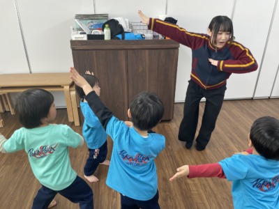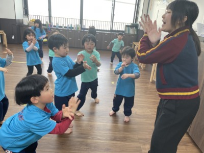 続いてはダンスの時間です。子どもたちが大好きなしなこの音楽が流れると、自然と身体が動き出し、笑顔いっぱいで何度も踊って楽しみました。振り付けを覚えようと集中する姿や、音楽に合わせて思いきり身体を動かす様子から、体力や表現力がしっかりと育ってきていることを感じます。