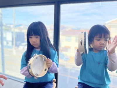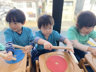 本日はカリキュラムの日ということで、まずは音楽活動から始まり、今回はドラムに触れる体験を行いました。ドラムの音が鳴ると、子どもたちは自然と身体を揺らしながら音に耳を傾け、音程やリズムに合わせて身体を動かしたり、楽器を鳴らしたりと、全身で音楽を感じて楽しんでいました。