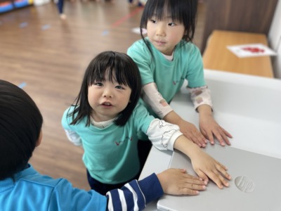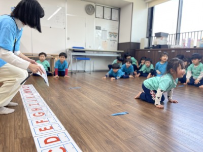 音楽のあとは英語のカリキュラムを行いました。講師の先生と一緒に色探しをしながら、「レッド!」「ブルー!」と英語の発音を楽しみ、遊びの中で自然と英語に親しむ時間となりました。恥ずかしがりながらも声に出して発音しようとする姿や、見つけた色を嬉しそうに教えてくれる表情がとても印象的でした。