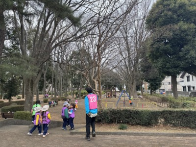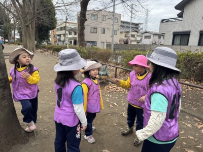 今日は2月20日、少し雲が広がる曇り空の一日でしたが、子どもたちの元気はお日さま以上で、登園してくるなり「今日はお外行く?」「公園行きたい!」と目を輝かせていました。今日は子どもたちの「今すぐ遊びたい!」という気持ちを大切にして、すぐに戸外の公園へ出発しました。