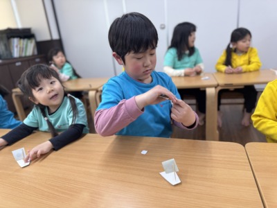 まずは小さなお船を作りました。お船の後ろに歯磨き粉をちょんとつけて水に浮かべます。「どうなると思う?」と聞くと、「沈むんじゃない?」「動かないよ」「爆発する?」とさまざまな予想が飛び交いました。「じゃあ、やってみようか」と静かに見守ると……。