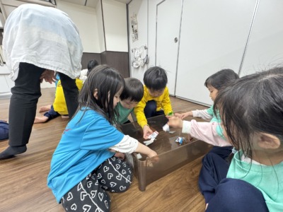「わっ、動いた!」「シューっていった!」「泡が出た!」と歓声が上がります。歯磨き粉に含まれる成分が水と反応し、表面張力の変化でお船が動く様子に、子どもたちは目を丸くしていました。5歳児の子どもが「なんで動くの?」と尋ねると、「水の力が変わったんだよ」と伝えると、「水ってすごいね」とつぶやきます。