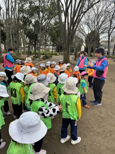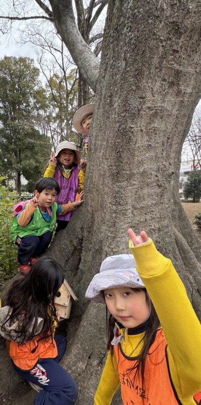 公園に着くと、まずは探検ごっこがスタートしました。木の根っこを「ここは秘密のトンネルだよ」と見立てたり、大きな石を「宝物発見!」と嬉しそうに触ってみたりと、子どもならではの発想がどんどん広がります。「先生、こっちに面白いのあった!」と友達を呼ぶ姿もあり、自然の中での発見を共有する姿がとても印象的でした。