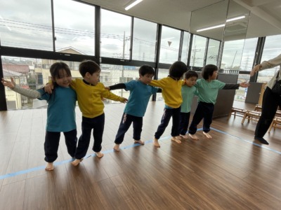 最後はダンスの時間です。「しなこ」や「milk」の曲に合わせて元気いっぱい踊りました。音楽が流れると自然と笑顔になり、振り付けもどんどん自信を持って踊れるようになっています。ダンスはリズム感だけでなく、自己表現や協調性も育てる大切なカリキュラムの一つです。