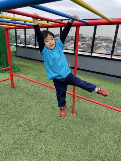 音楽のあとは少し時間があったので、屋上へ行きました。曇り空でも外の空気は気持ちよく、子どもたちはのびのびと走り出します。今日は特に雲梯に挑戦する子どもが多く見られました。「やってみたい!」という気持ちが強く、何度もぶら下がっては挑戦する姿が印象的でした。