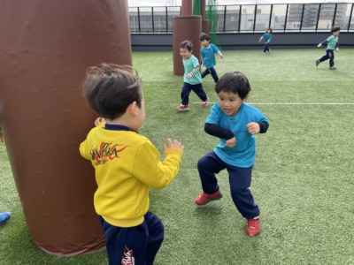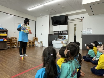 屋上でたっぷり身体を動かしたあとは、英語の時間です。今日は身体を動かしながら英語を学びました。ジャンプしながら単語を言ったり、ジェスチャーを交えながら発音したりと、楽しみながら自然に英語に触れています。「もう一回言いたい!」という声もあり、前向きな姿勢が見られました。