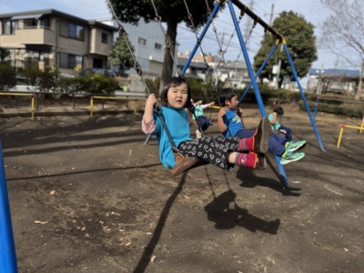 避難訓練を終えた後は、気持ちを切り替えて公園で遊びます。空気の冷たさを跳ね返すかのように、子どもたちはすぐにブランコやすべり台、そして大好きな鬼ごっこをはじめました。足音と笑い声が響きわたり、凛とした空気の中にも温かいエネルギーが満ちていました。先生のお話をしっかり聞くお手本のような姿勢から、ふとした瞬間のキラキラした笑顔まで、公園での自由遊びは子どもたちにとって格別のリフレッシュタイムになったようです。