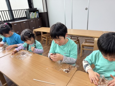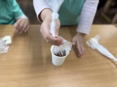 室内に戻り、サイエンスの時間。本日は「チョコレートの温度変化」をテーマに、溶かしたチョコを冷やして再び固める実験に挑戦しました。