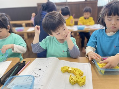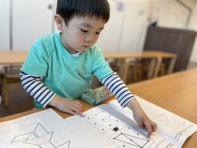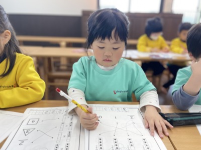 個別対応保育を意識しながら、それぞれの理解度に合わせて声をかけています。少し迷っている子どもには、「どこが難しいかな?一緒に見てみよう」と寄り添い、すらすら進む子どもには「よく考えたね」「すごい集中してるね」と具体的に認めています。幼児教育は、できる・できないの結果だけではなく、取り組む過程を大切にしています。