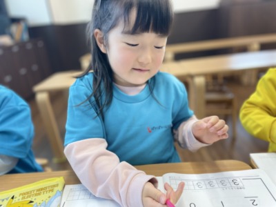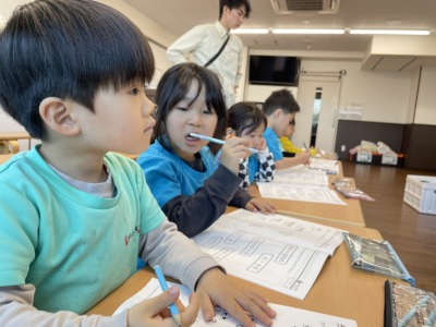 ワークを配ると、子どもは自然と机に向かい、自分のペースでどんどん進めていきました。以前は「これでいい?」と何度も確認していた子どもも、今日は自分で考えて丸をつける姿が見られました。「先生、できたよ」「次やっていい?」と前向きな言葉がたくさん聞こえてきます。こうした姿は、日々のカリキュラムの積み重ねの成果だと感じます。