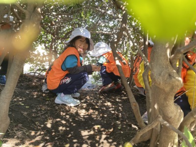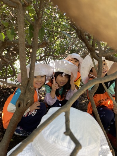 木登りに挑戦する子どももいました。「先生、見ててね」と慎重に足をかけ、少しずつ登っていきます。「ここ、つかまれるよ」「ゆっくりね」と声をかけると、自分でバランスを取りながら進みます。成功すると満面の笑みで「できた!」と誇らしそうです。こうした経験が自己肯定感につながっていきます。