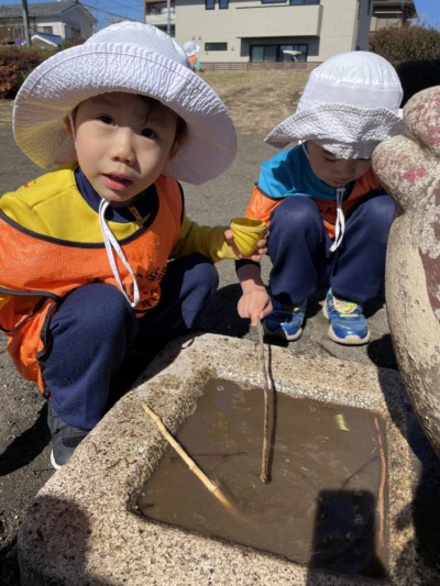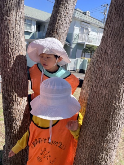 算数のあとは、楽しみにしていた公園へ向かいました。晴れた空の下、風がとても気持ちよく、春の訪れを感じられる陽気でした。公園に到着するとすぐに、「かくれんぼしよう!」「先生、木登ってもいい?」と元気な声が広がります。遊びを自分たちで考え、すぐに動き出せる姿に成長を感じます。