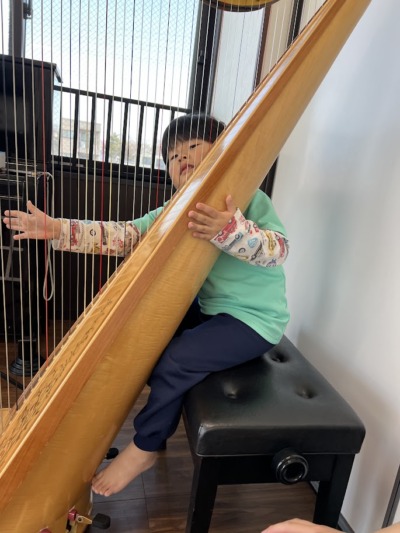 最後は楽器体験!椅子に座って大きなハープをポロン♪